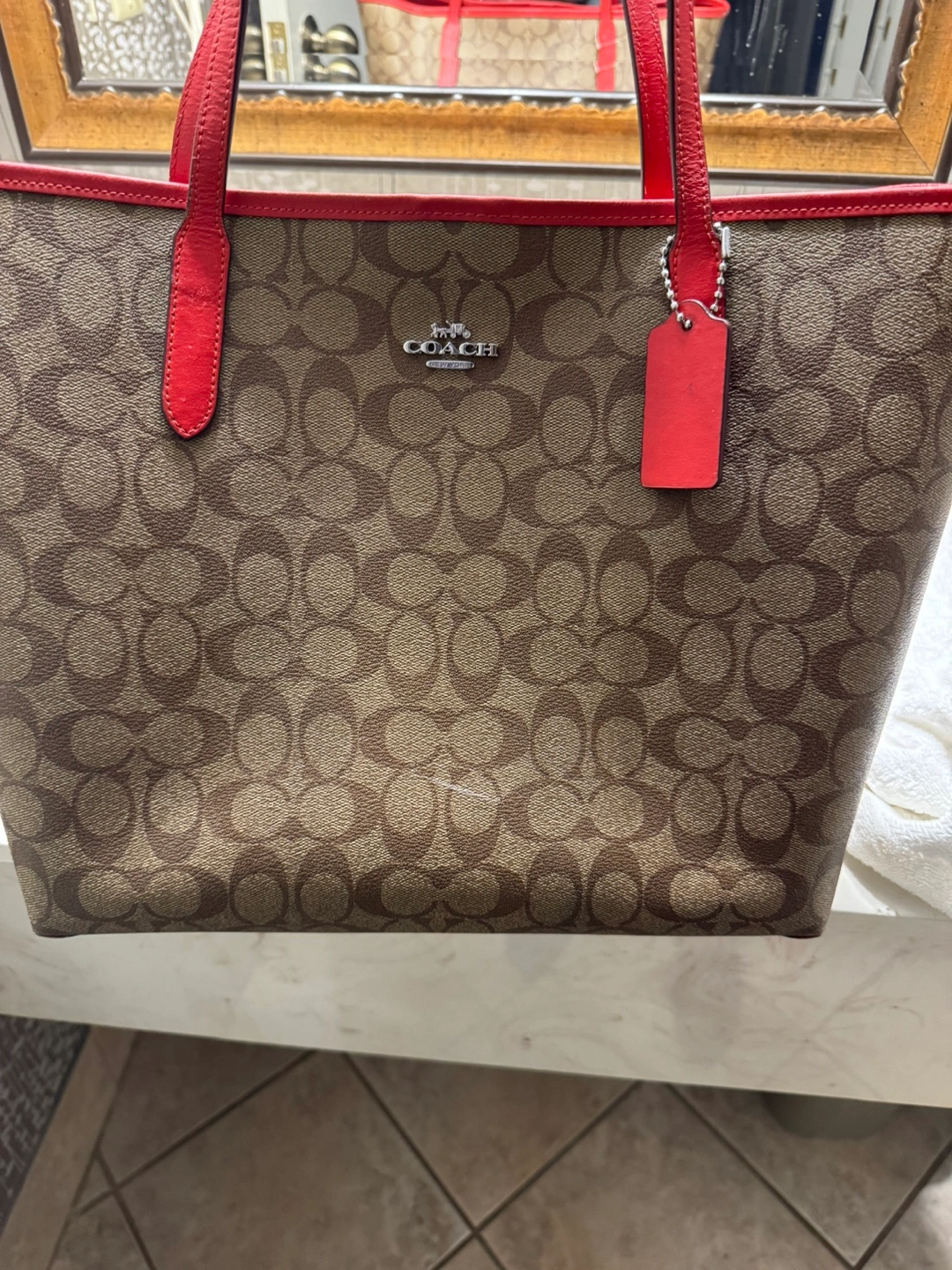 Coach Tote Bag - Brown Signature Canvas with Red Accents