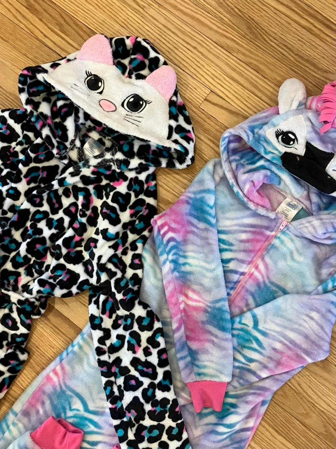 Jellifish Leopard Robe [size 10/12] - would say on the smaller end. Very cozy long sleeve robe. Colourful leopard spots and hood with cat ears. The tie sits in loops around the waste to close the robe.