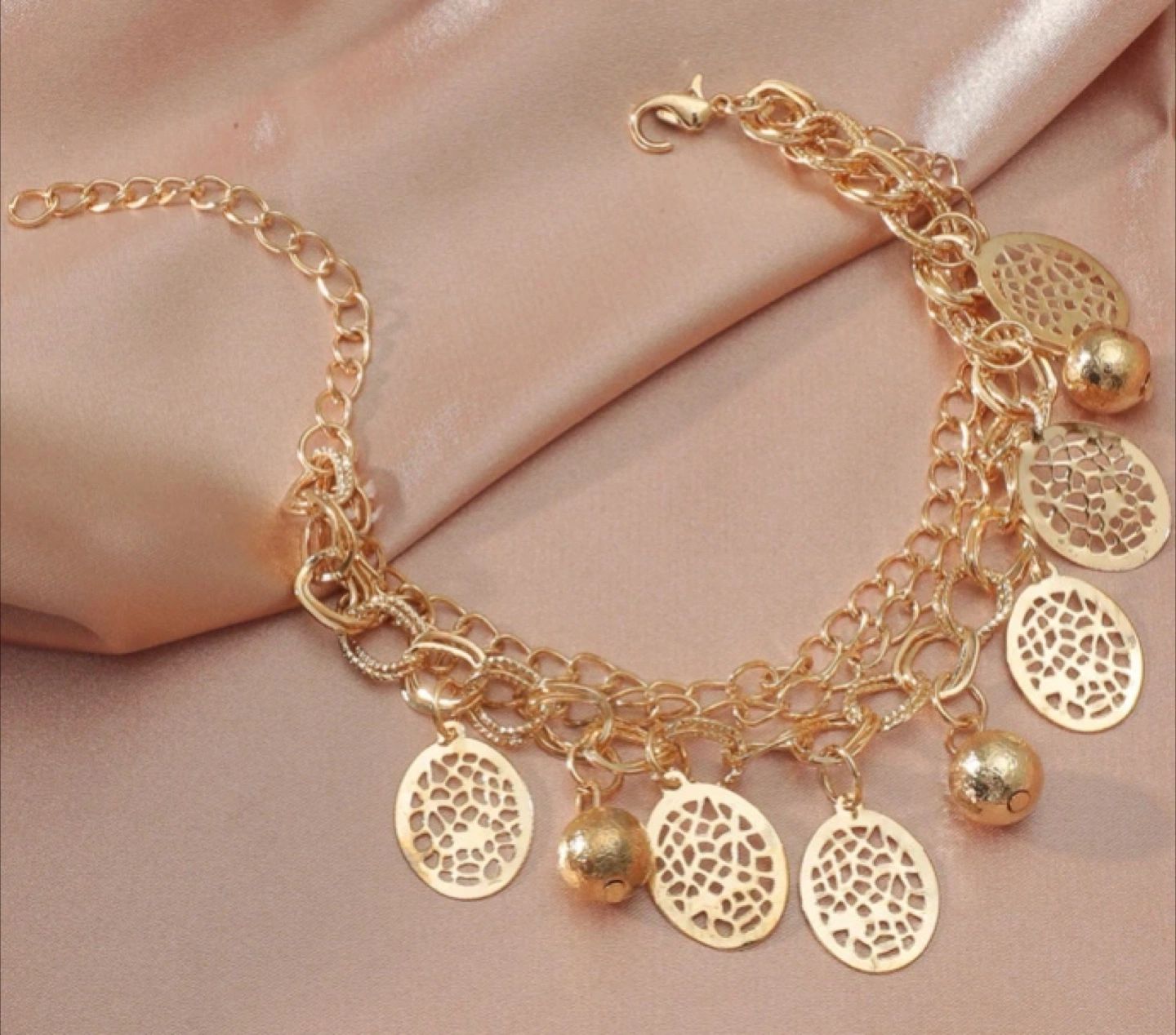 Gorgeous gold bracelet. Features multiple chains and dangling charms. Perfect for adding a touch of elegance to any outfit. Lightweight and comfortable to wear.