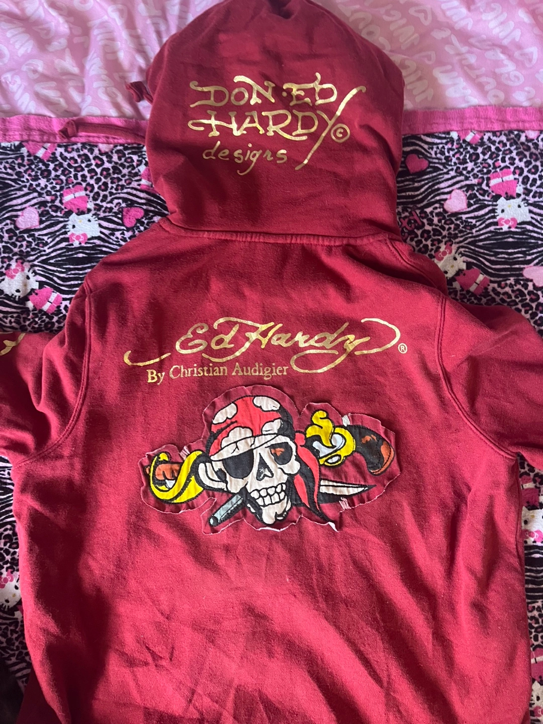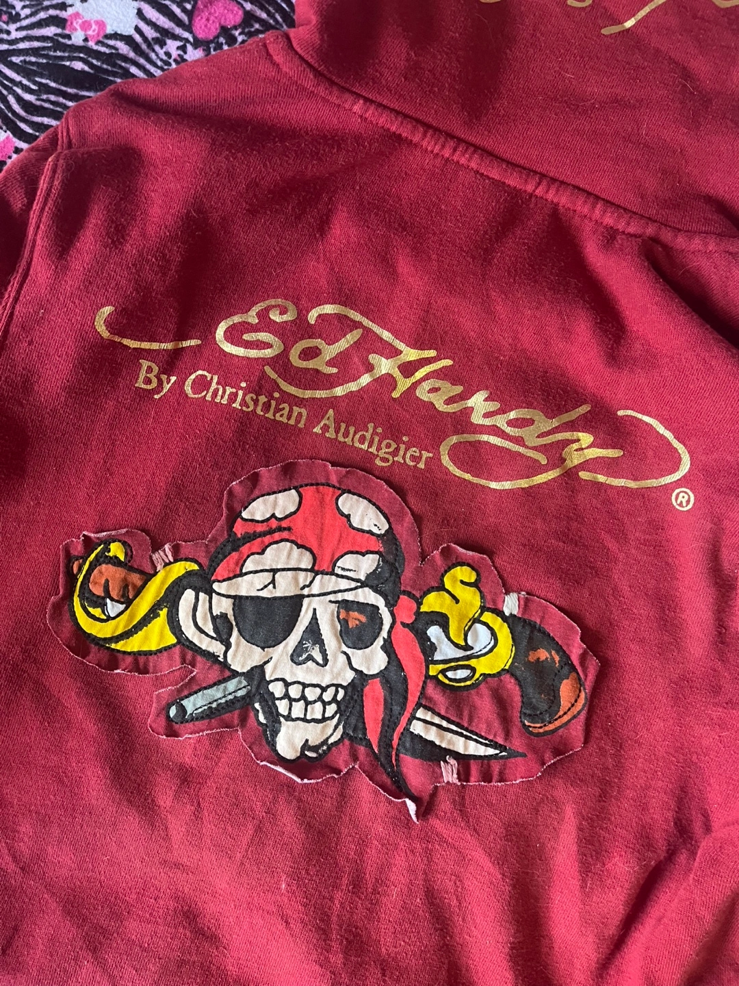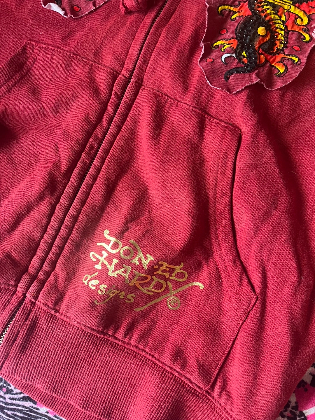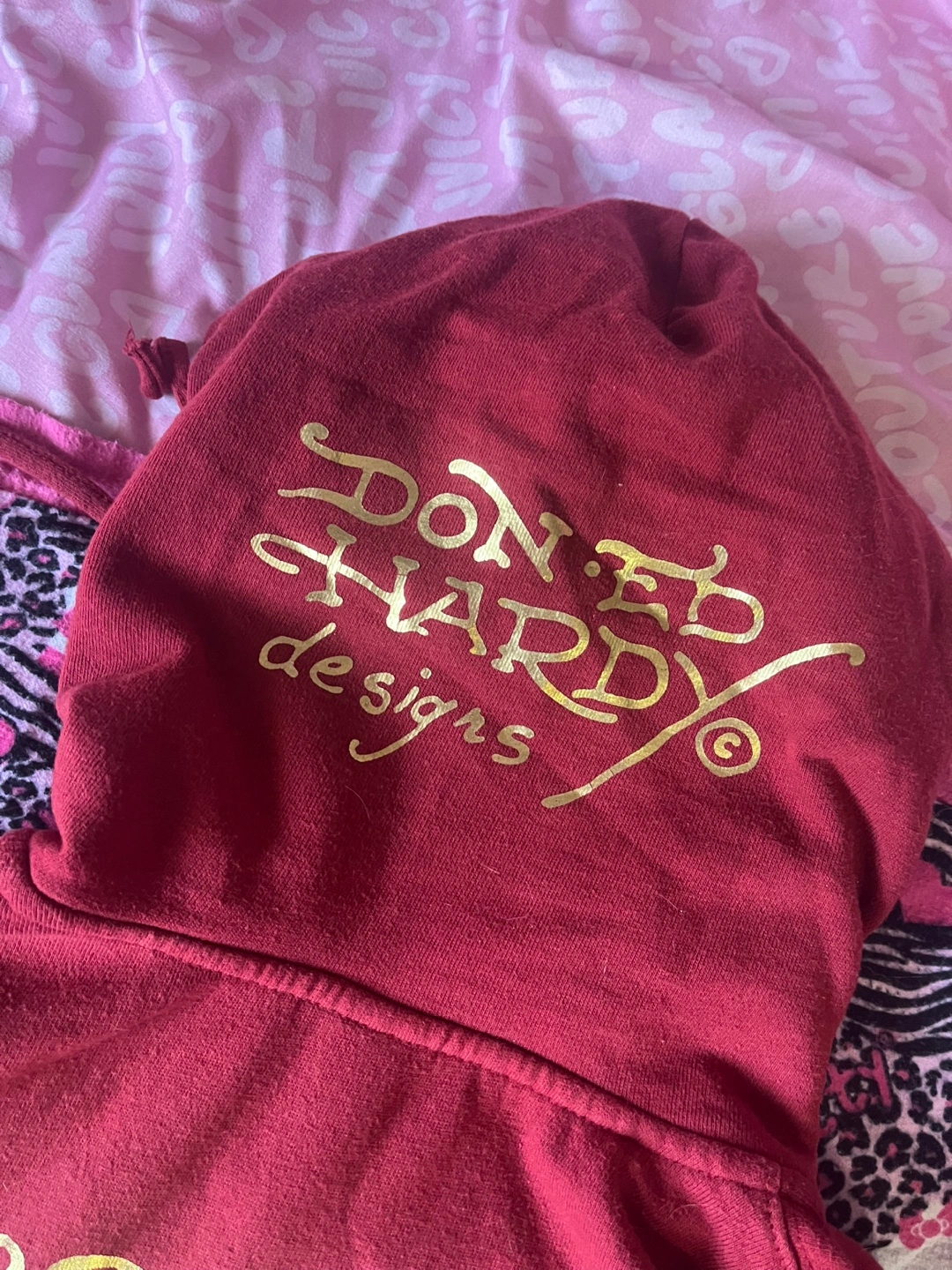 Women's Ed Hardy burgundy zip-up hoodie. Features a sherpa-lined hood, embroidered designs, and gold lettering. Size medium.