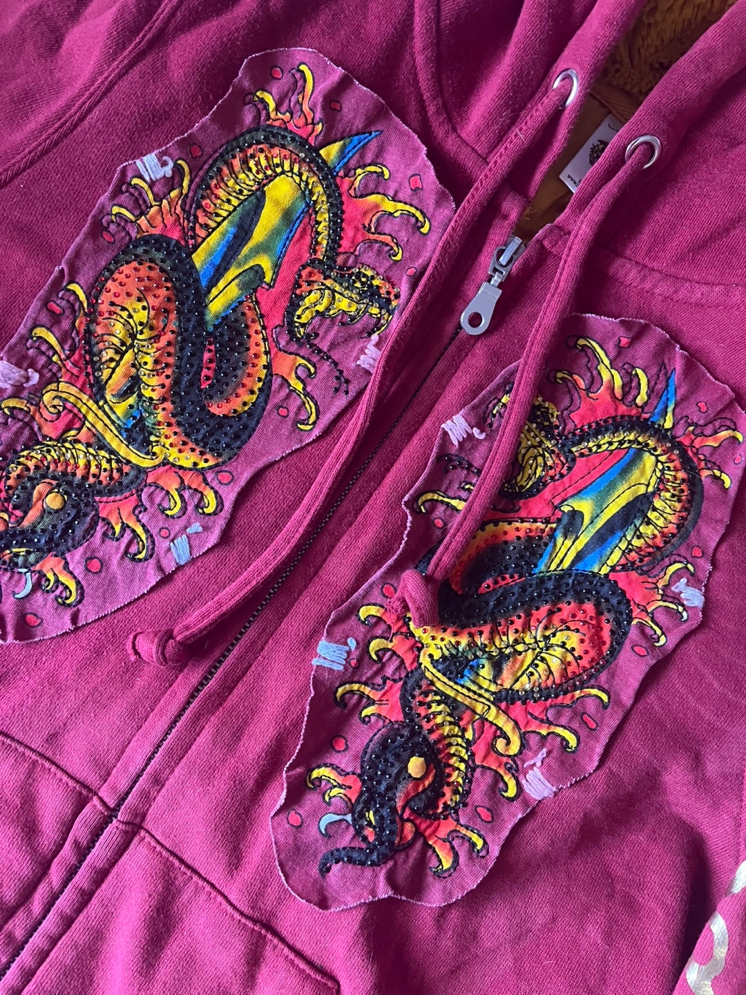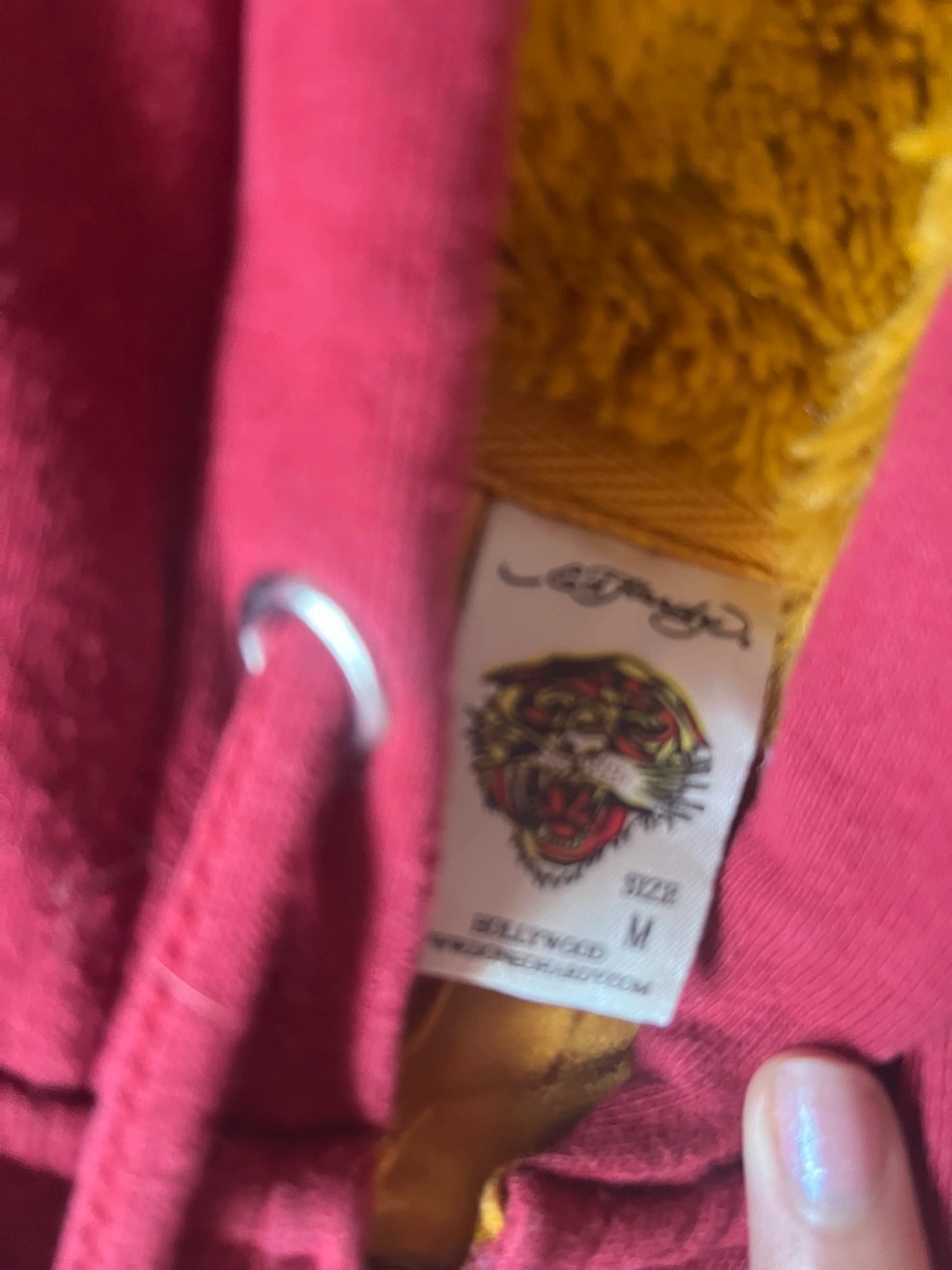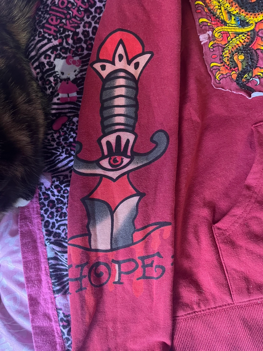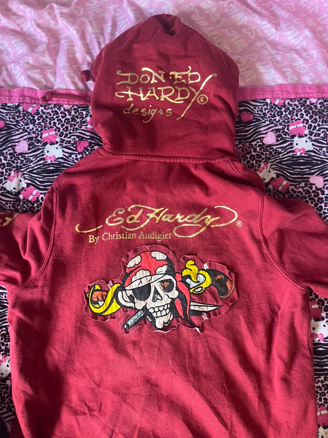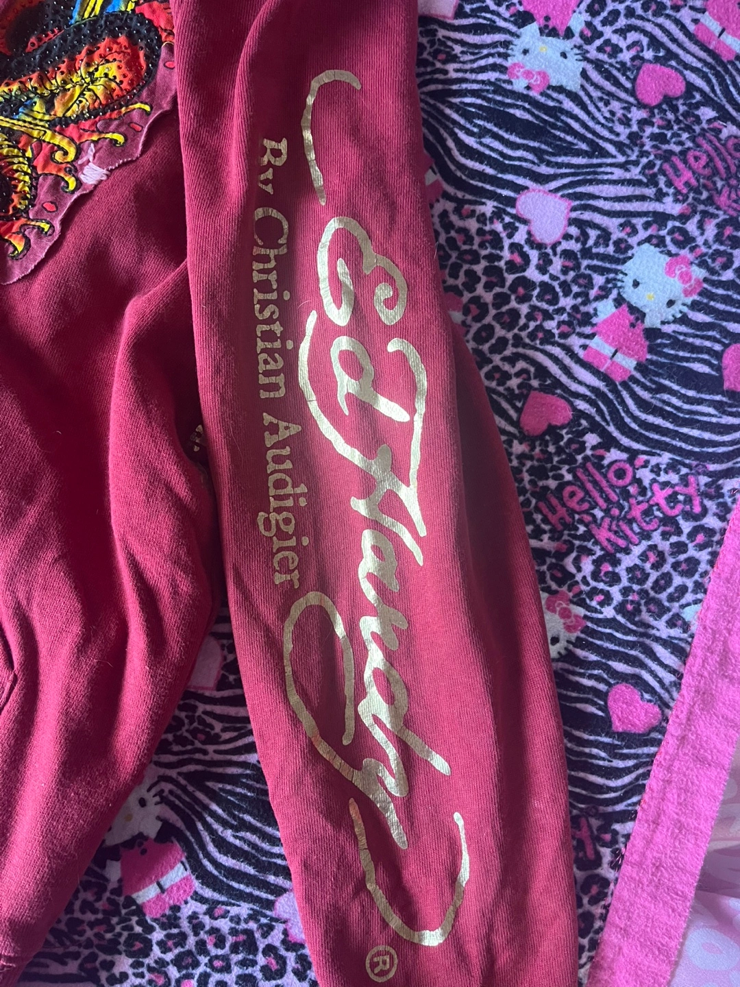 Women's Ed Hardy burgundy zip-up hoodie. Features a sherpa-lined hood, embroidered designs, and gold lettering. Size medium.