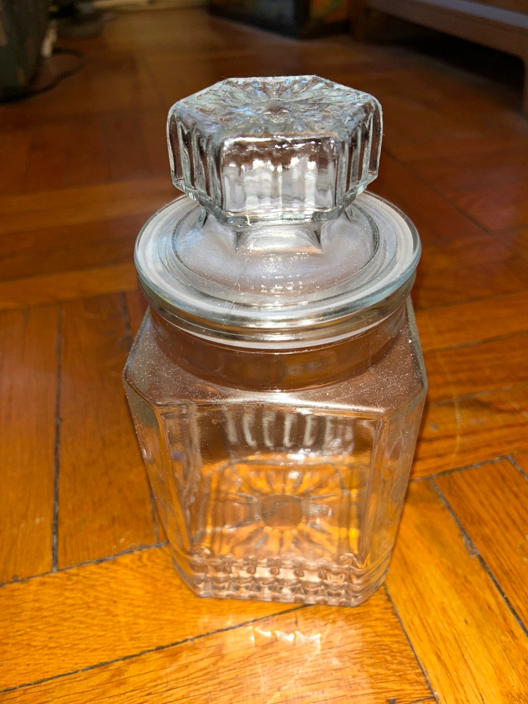 1000+Large Koeze vintage glass candy/cookie jar with a hexagonal lid. Perfect for storing candy, cookies, or other treats. Glass is clear with subtle texture. Top fits well with good seal. Excellent condition