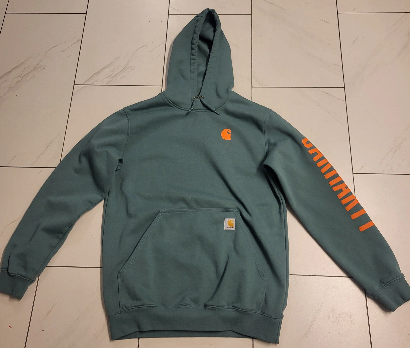 Men's teal Carhartt WIP hoodie. Size medium. Features orange Carhartt logo on sleeve and small logo on chest. Rain Defender technology. Kangaroo pocket. only used once