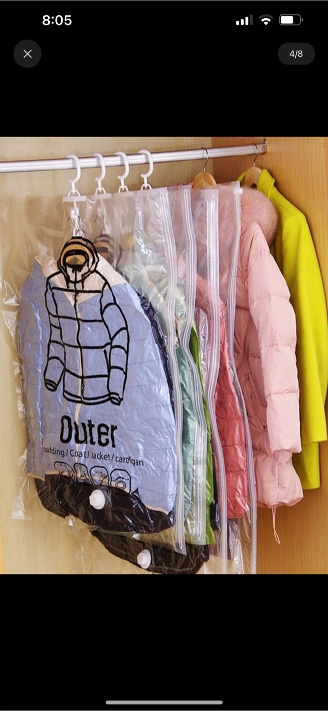 Set of clothing storage bags. Great for seasonal clothes. Multiple sizes available. Vacuum/pump (not included) sealed for compact storage.