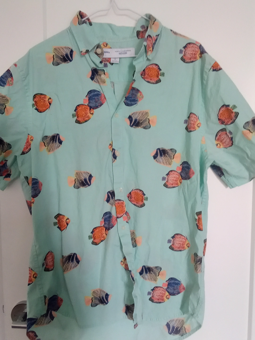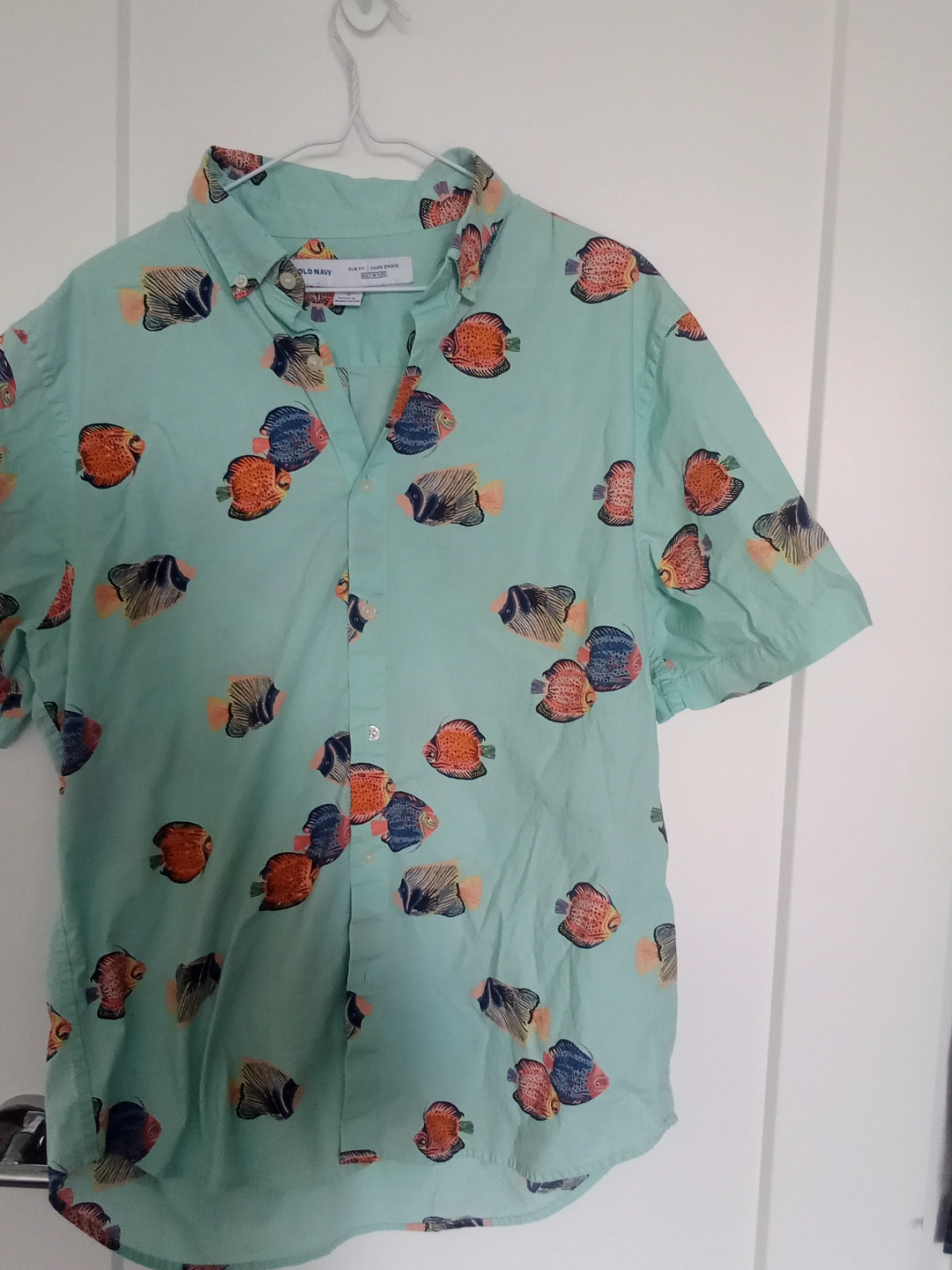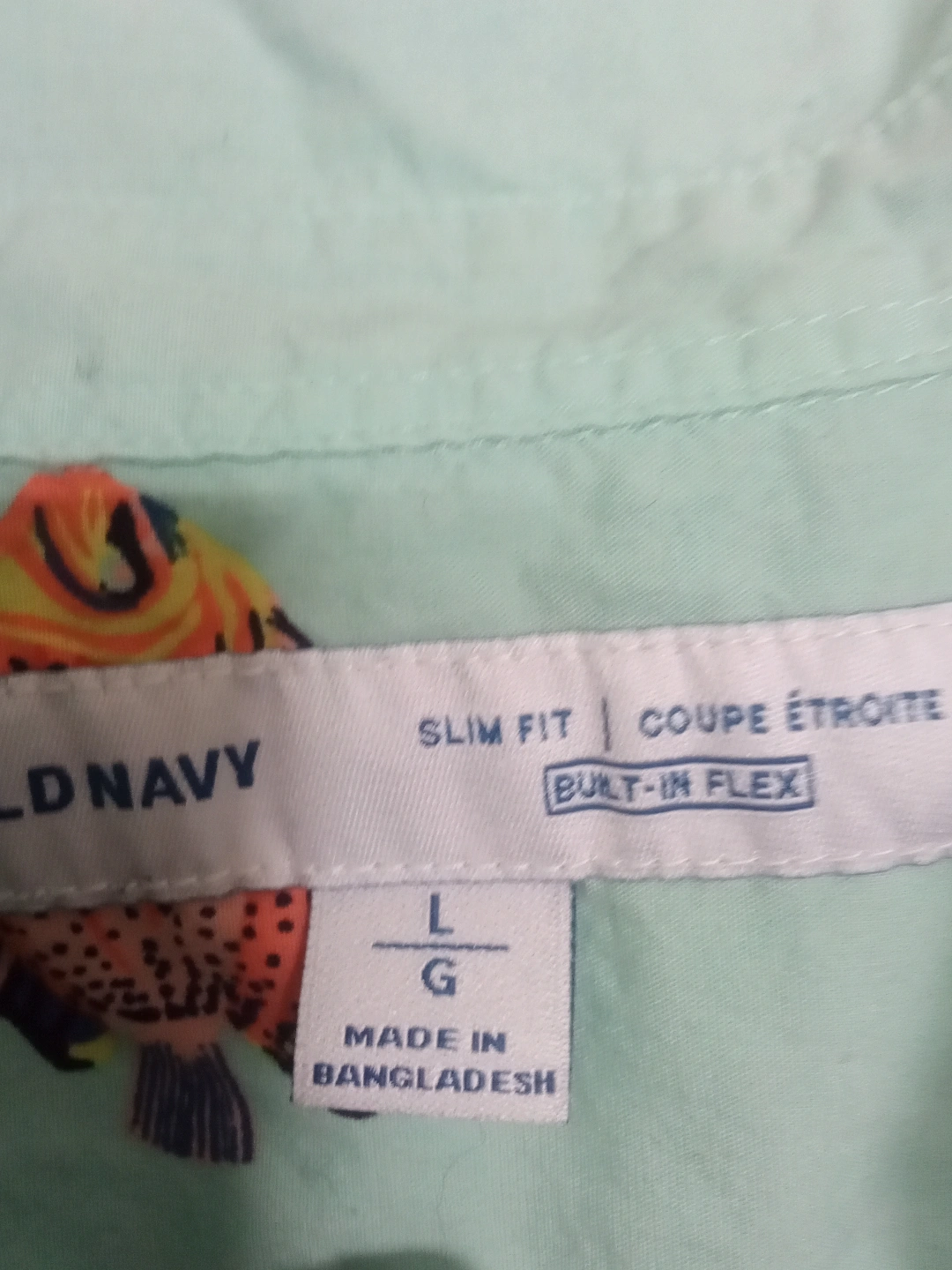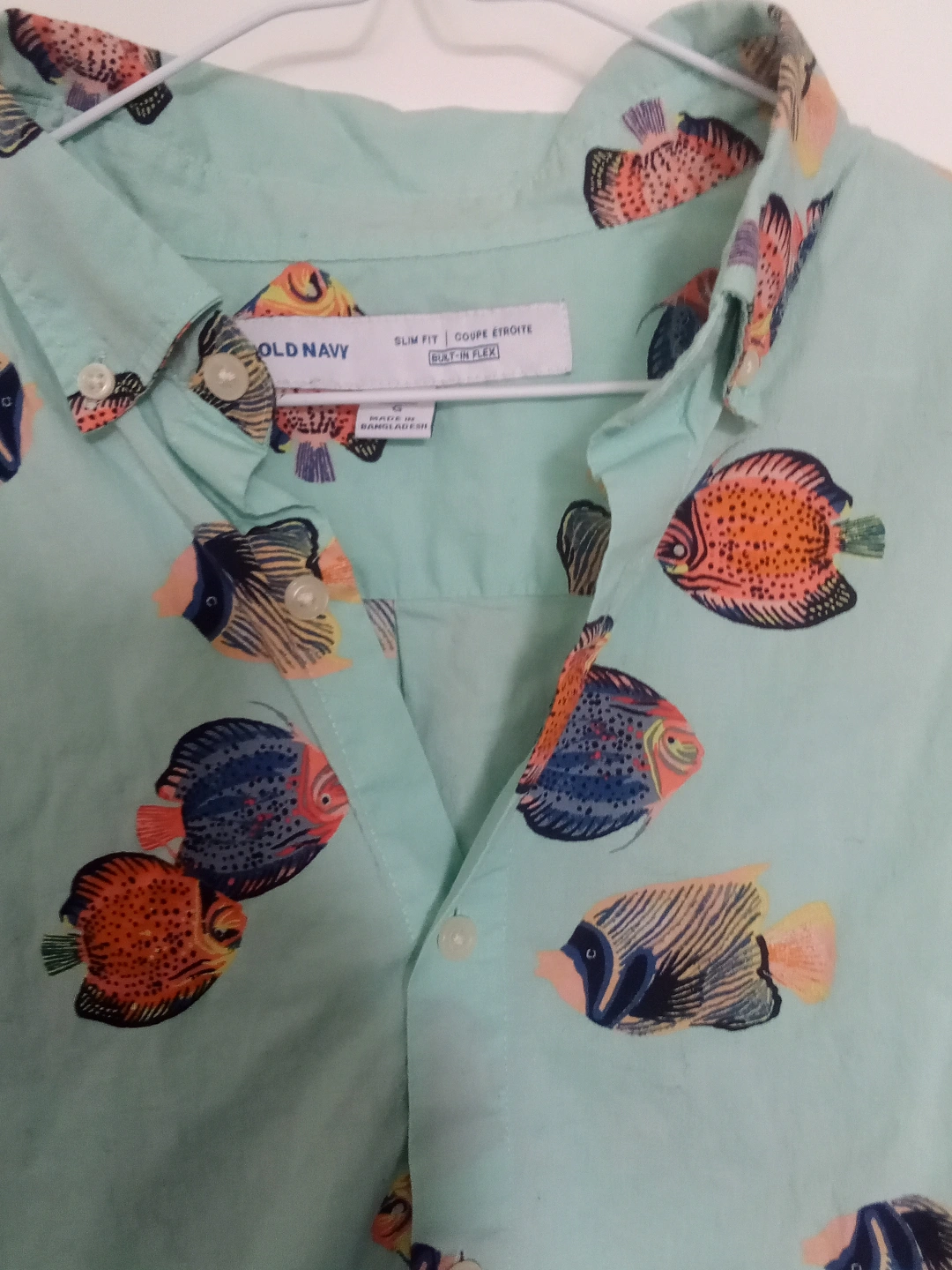 Men's Old Navy shirt. Size large. Slim fit. Short sleeves. Mint green colour. Features a colourful fish print. Built-in flex.
