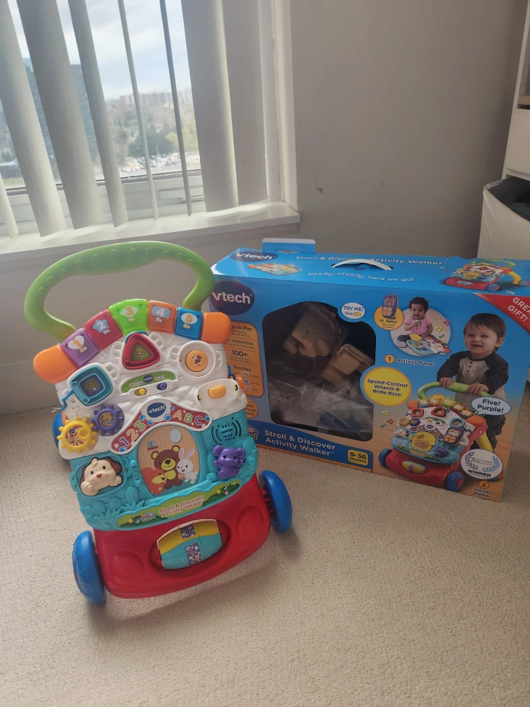 Gently used VTech baby walker. Includes box. Suitable for 9-36 months. Features lights, sounds, and interactive activities. Great for helping your little one learn to walk.