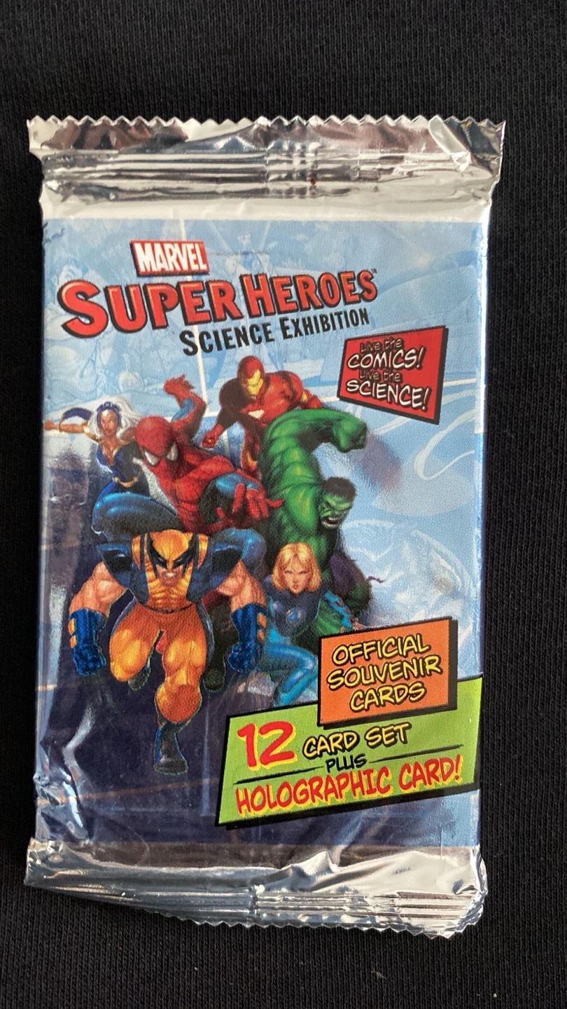 Sealed pack of 12 Marvel Super Heroes Science Exhibition souvenir cards. Includes one holographic card. Great for collectors! Only one available , first come first serve