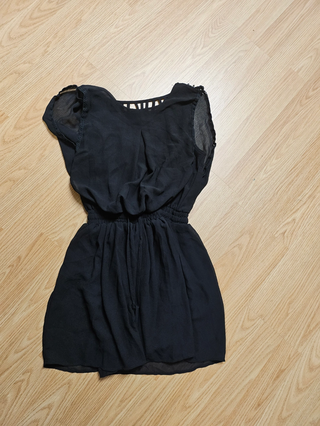 Cute black mini romper. Features a unique back detail and cinched waist. Made of a lightweight material. Size XS.