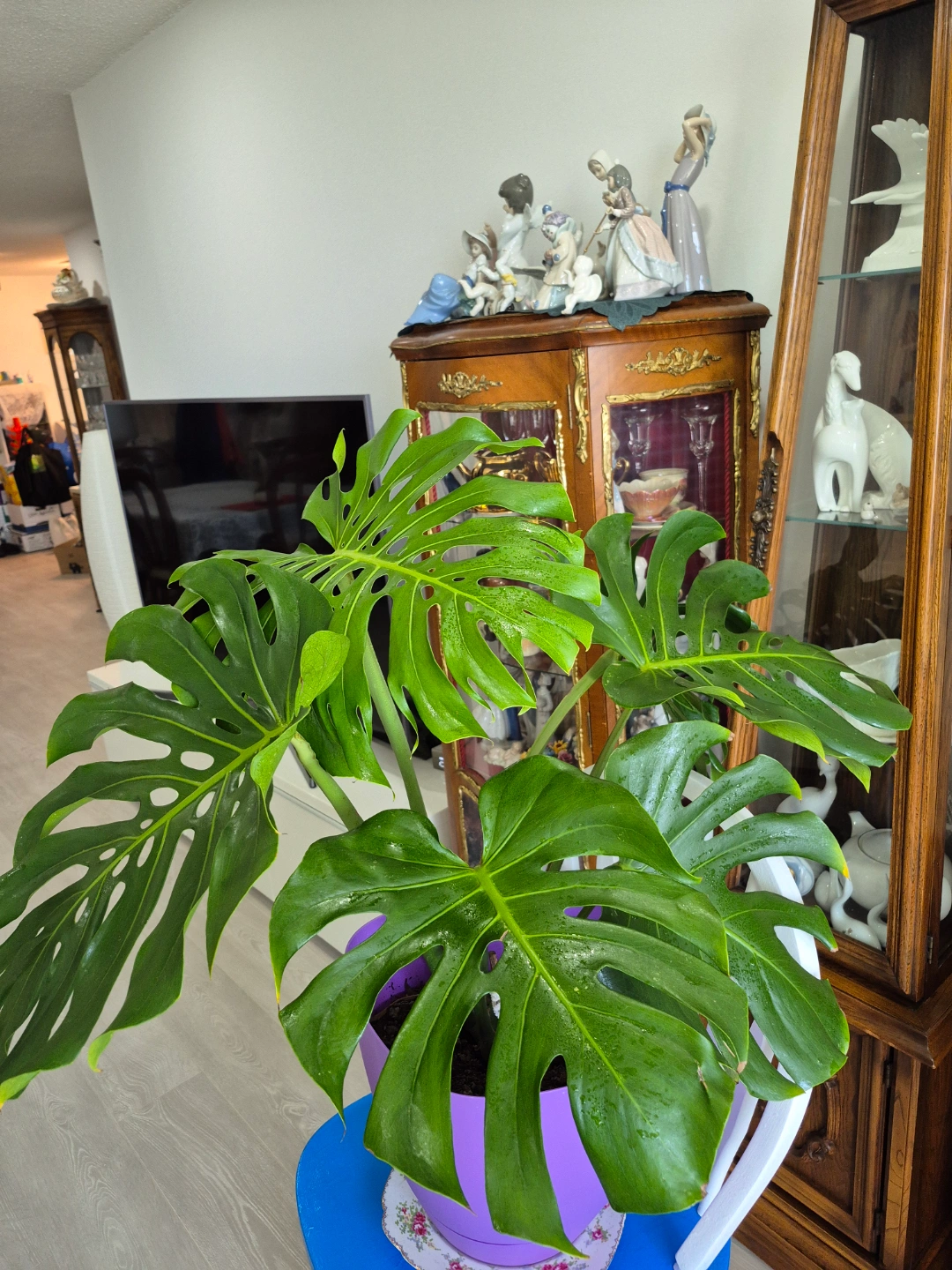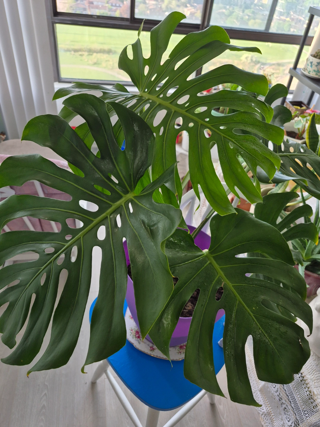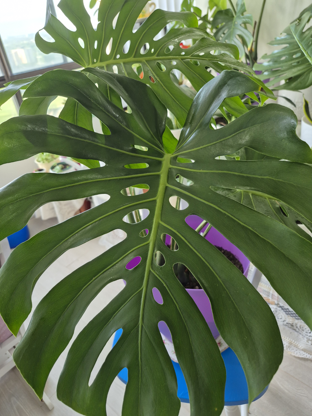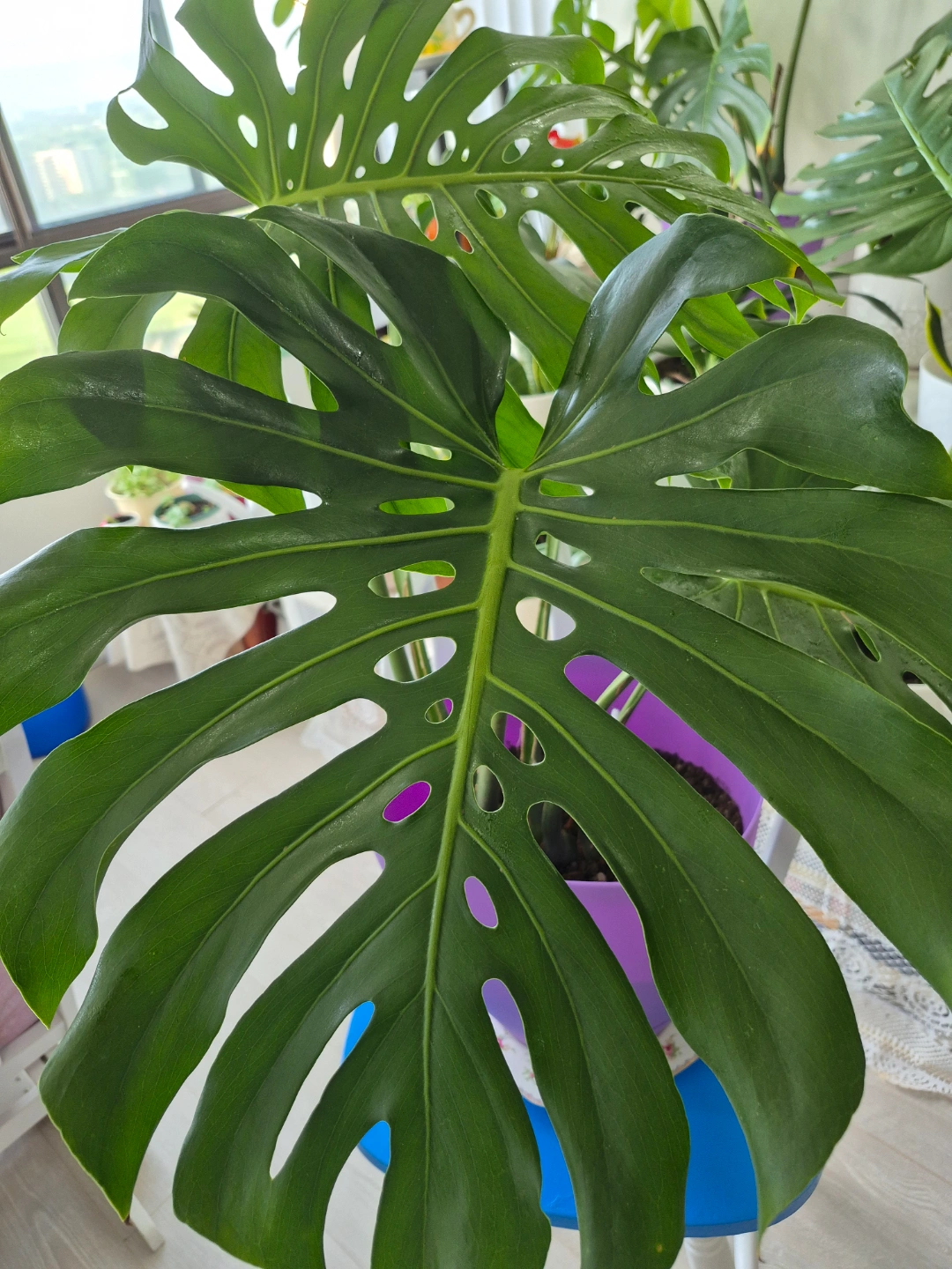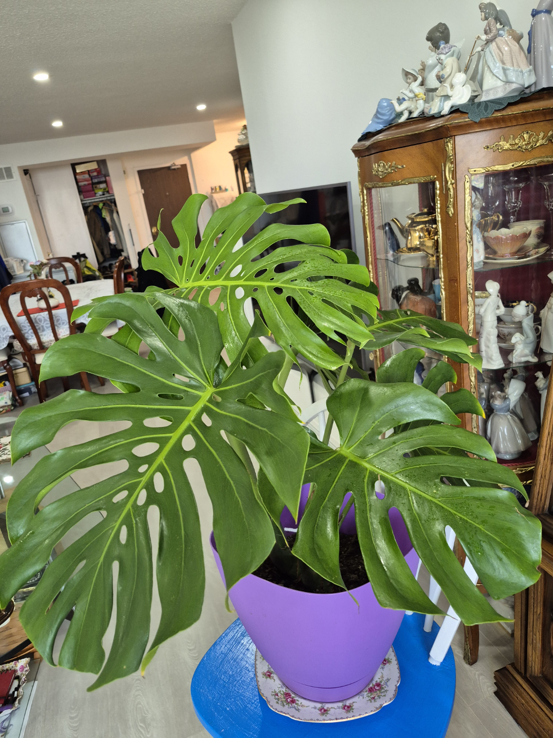 Monstera brightens the atmosphere of the house and brings good energy that attracts wealth to the house.Healthy Monstera deliciosa in a purple pot. Multiple large leaves. Great addition to any home.
