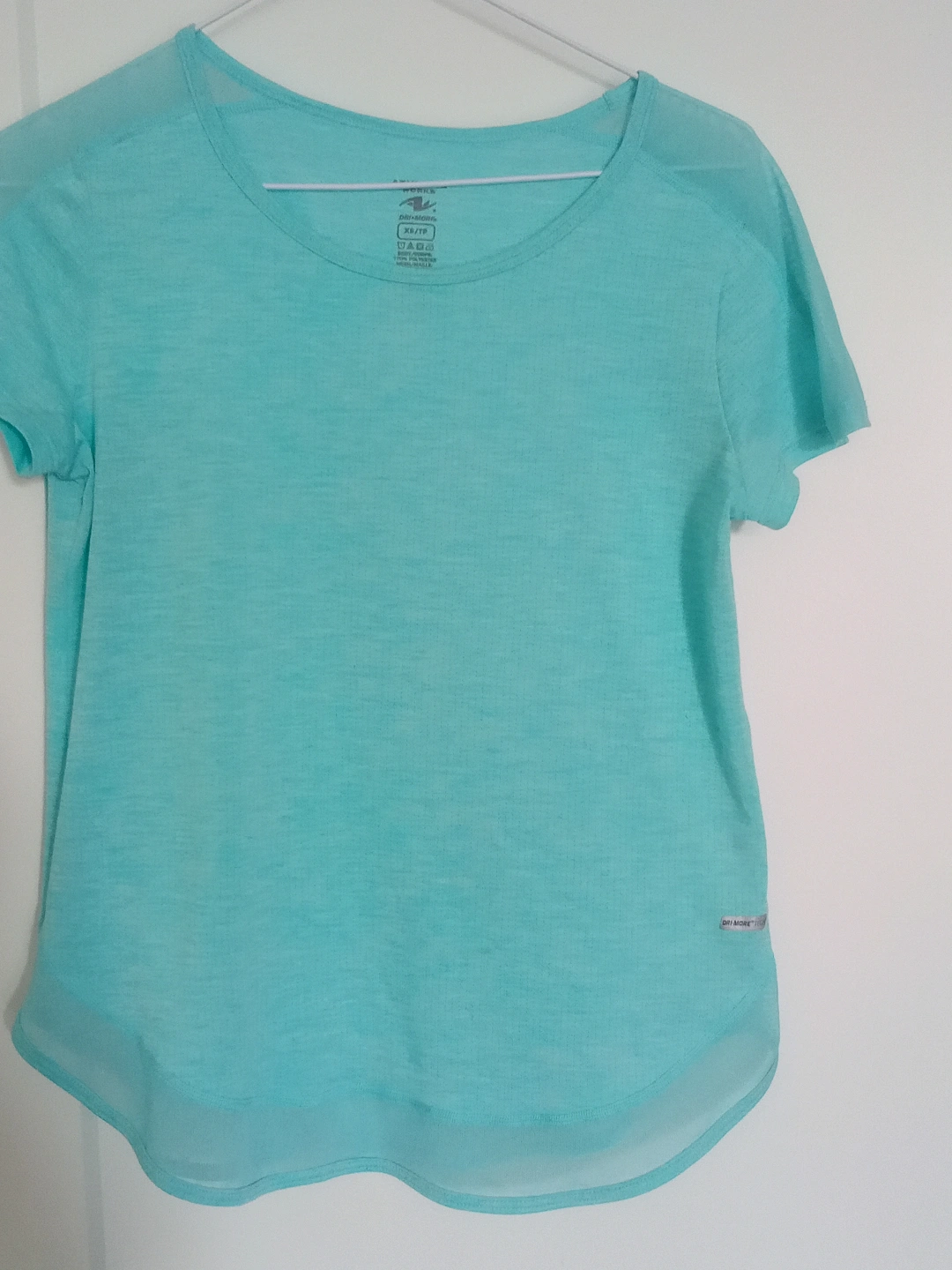 Athletic Works women's t-shirt. Size XS. Teal colour. Dri-More technology. Short sleeves. Mesh detailing. Slight sheer bottom hem.