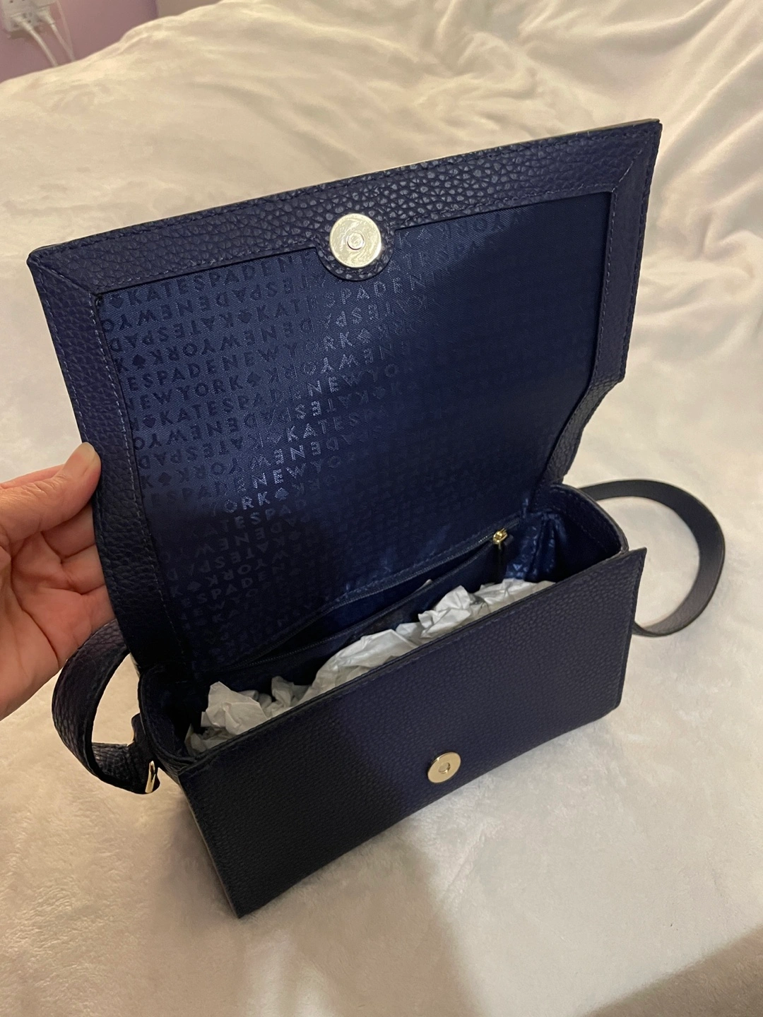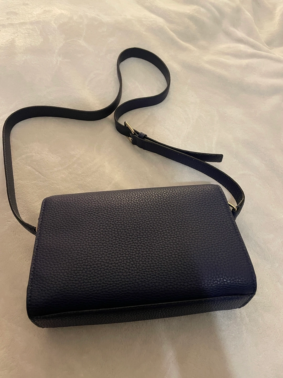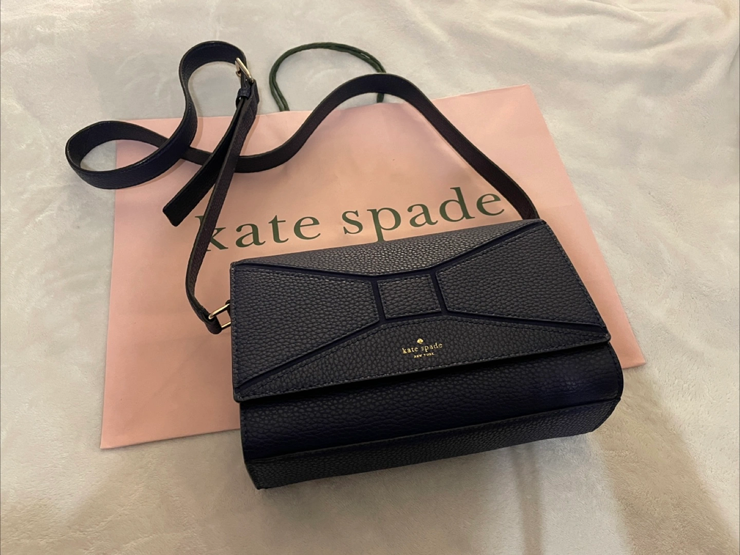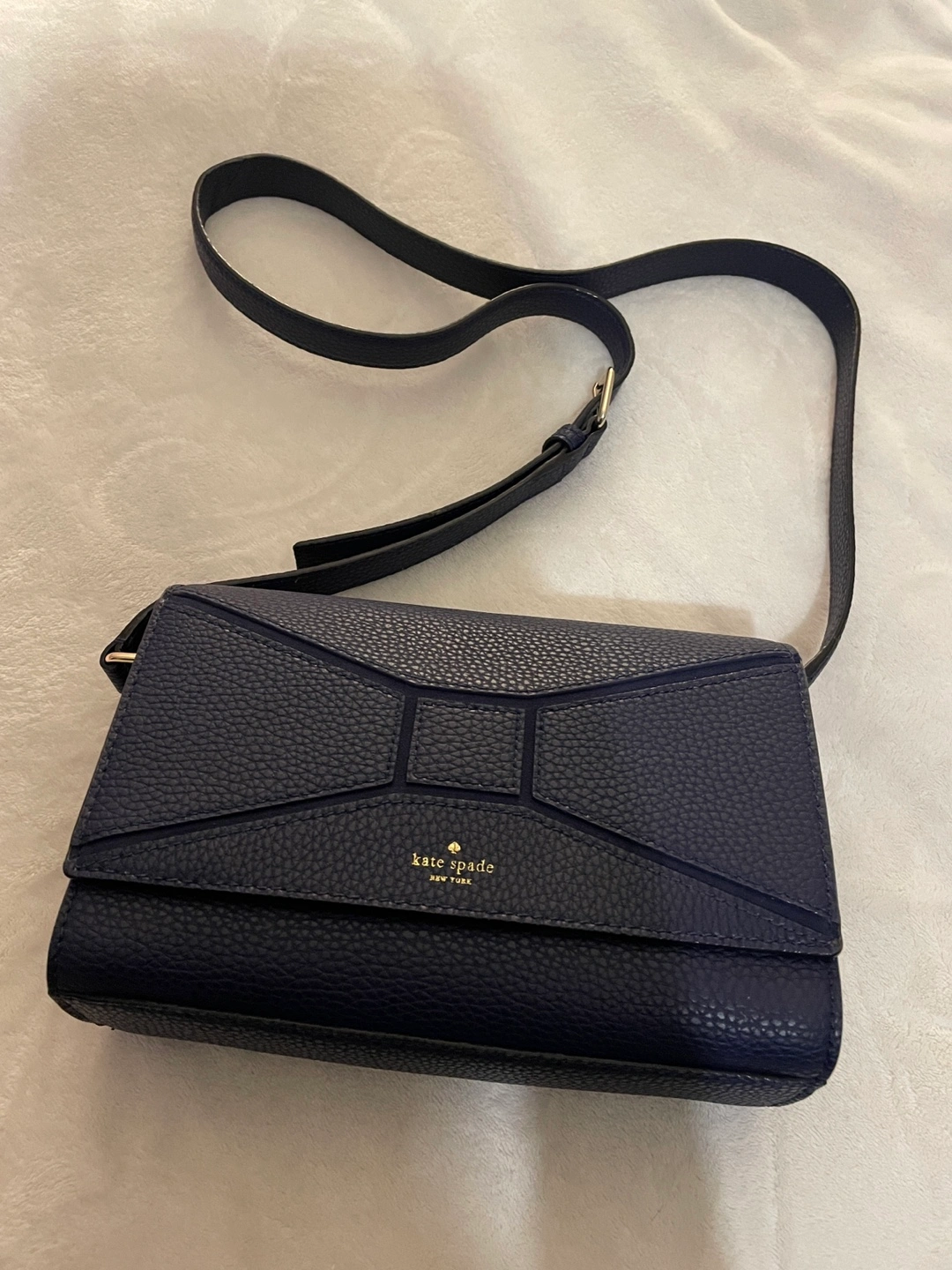 Navy blue crossbody bag. Features a unique bow design and adjustable strap. Excellent condition.