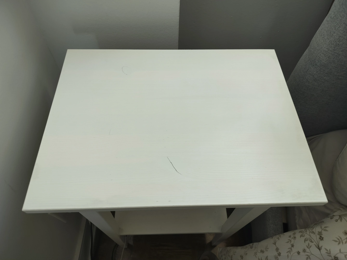 Small white nightstand. One drawer and a lower shelf. Minimalist design. Some minor wear.