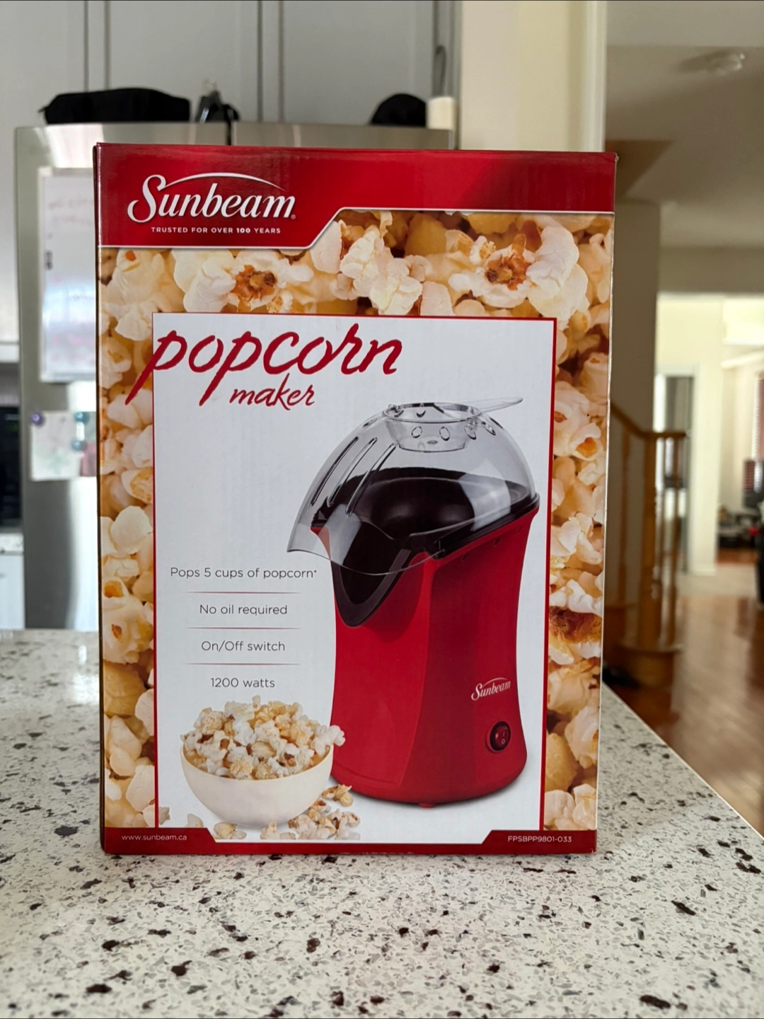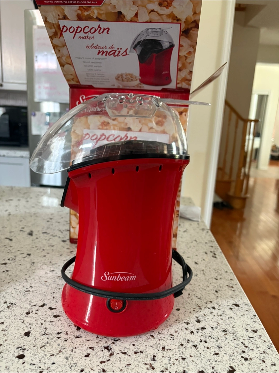 Red popcorn maker. Fun for movie nights! Makes 5 cups of popcorn. No oil required. Like New condition in box with all parts.