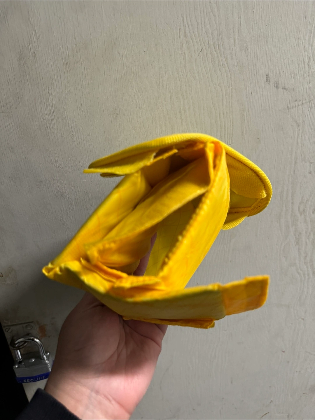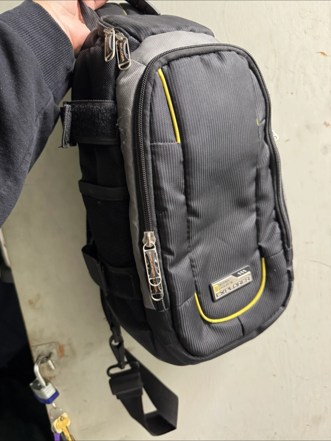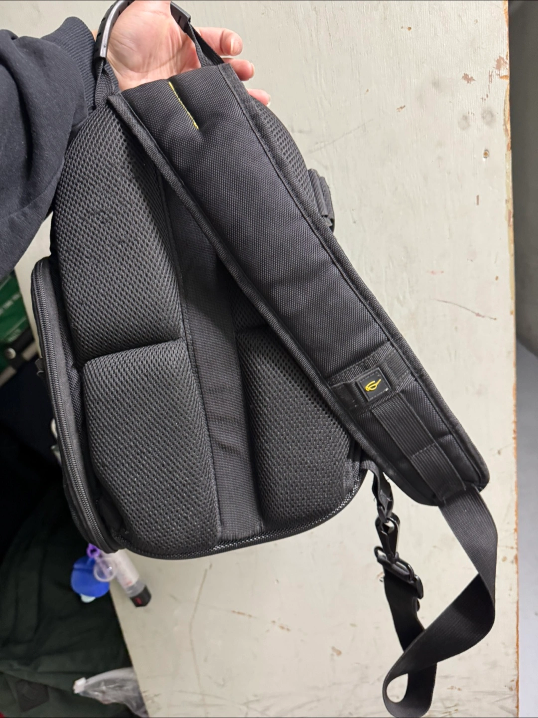 Black and grey sling bag. Multiple compartments and pockets. Yellow interior. Adjustable shoulder strap.