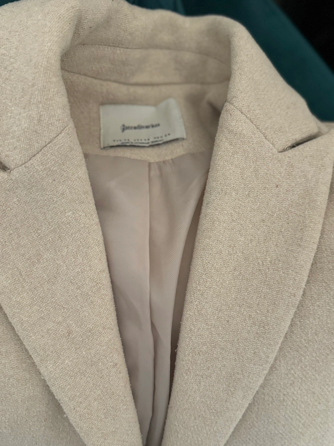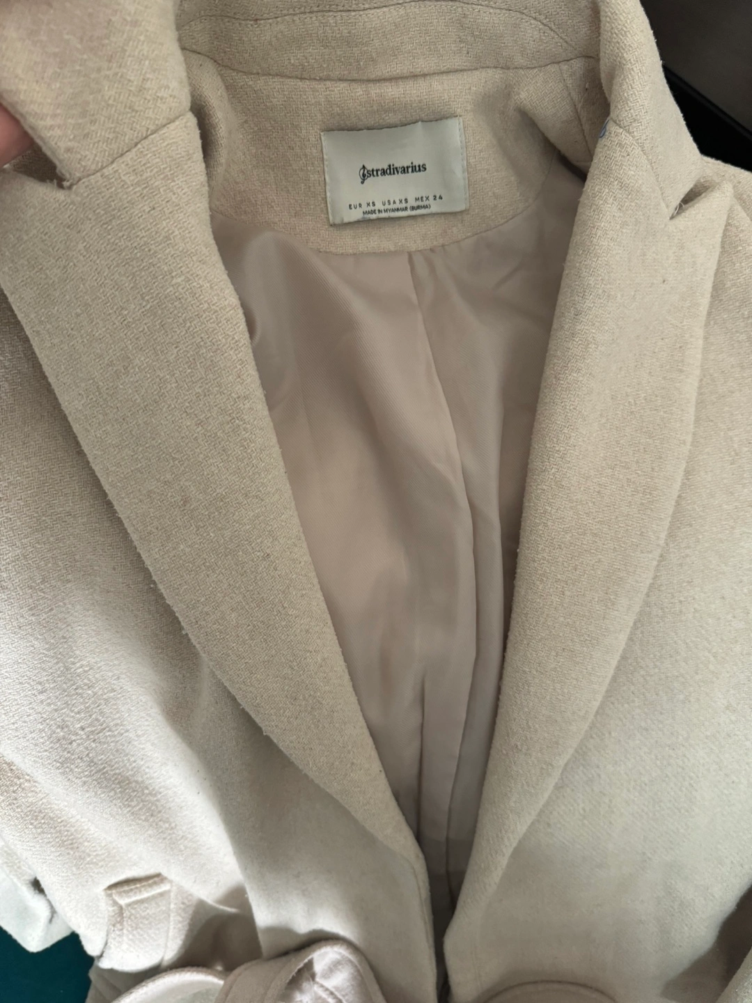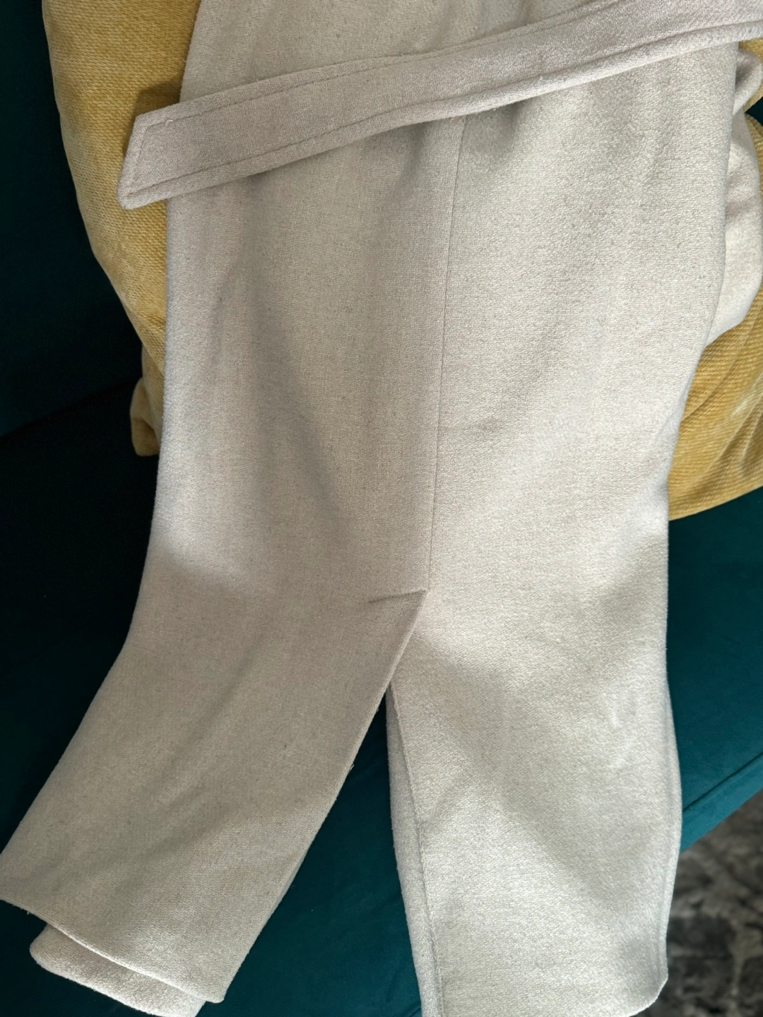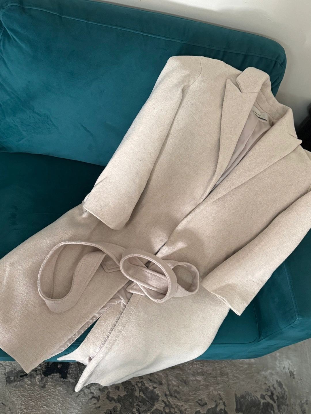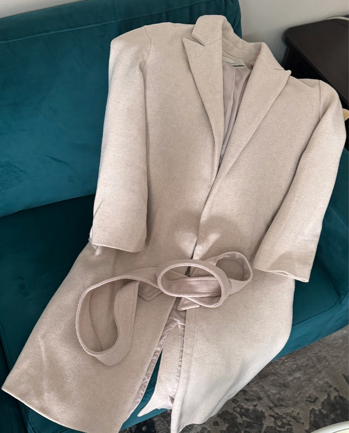 Cream-colored long coat. Features a belted waist and long sleeves. Made of wool blend fabric. Classic style.