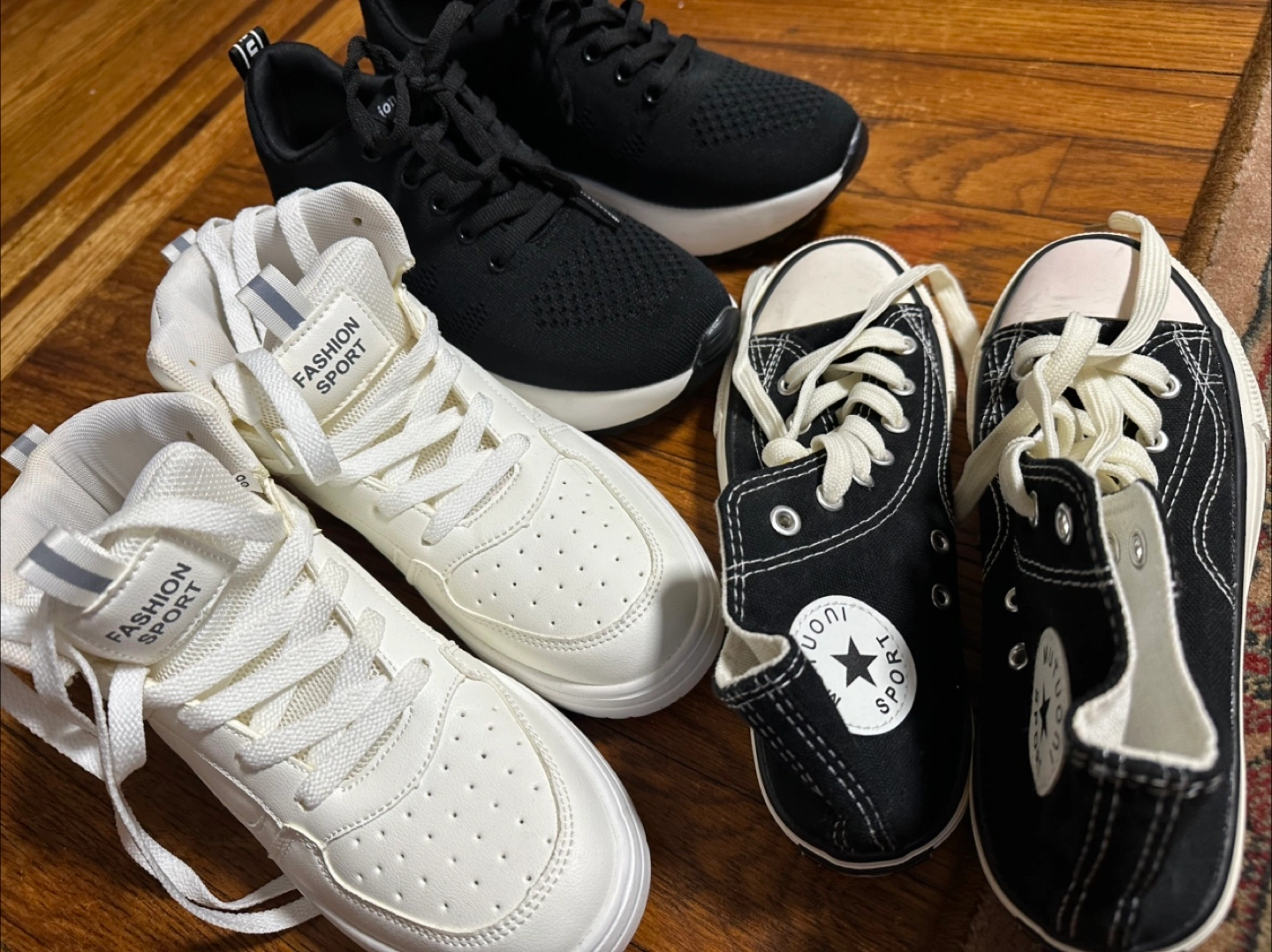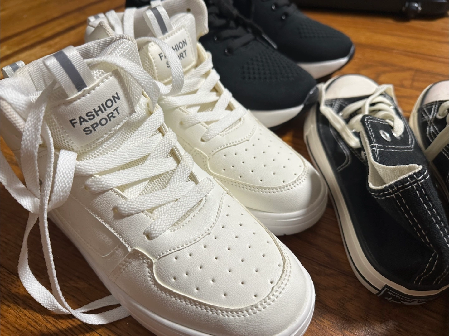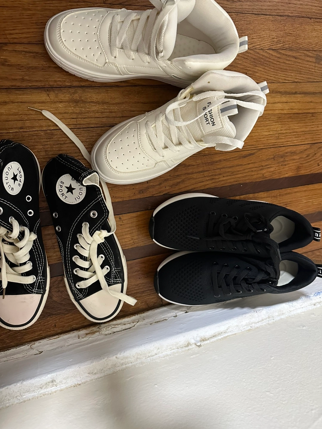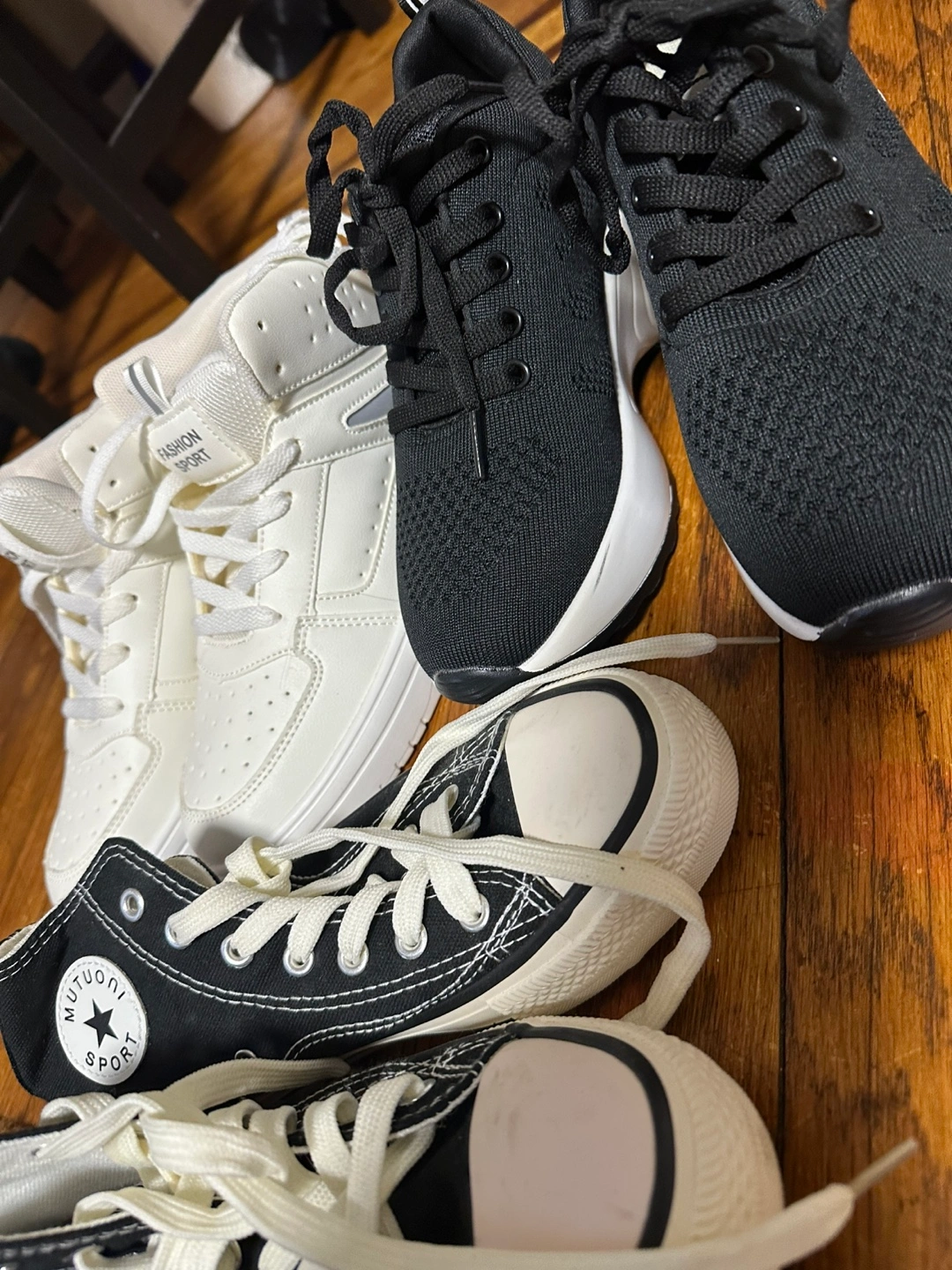 Bundle of three pairs of women's sneakers. Includes one pair of white high-top sneakers with 'Fashion Sport' branding, one pair of black knit low-top sneakers, and one pair of black canvas high-top sneakers with a star logo.