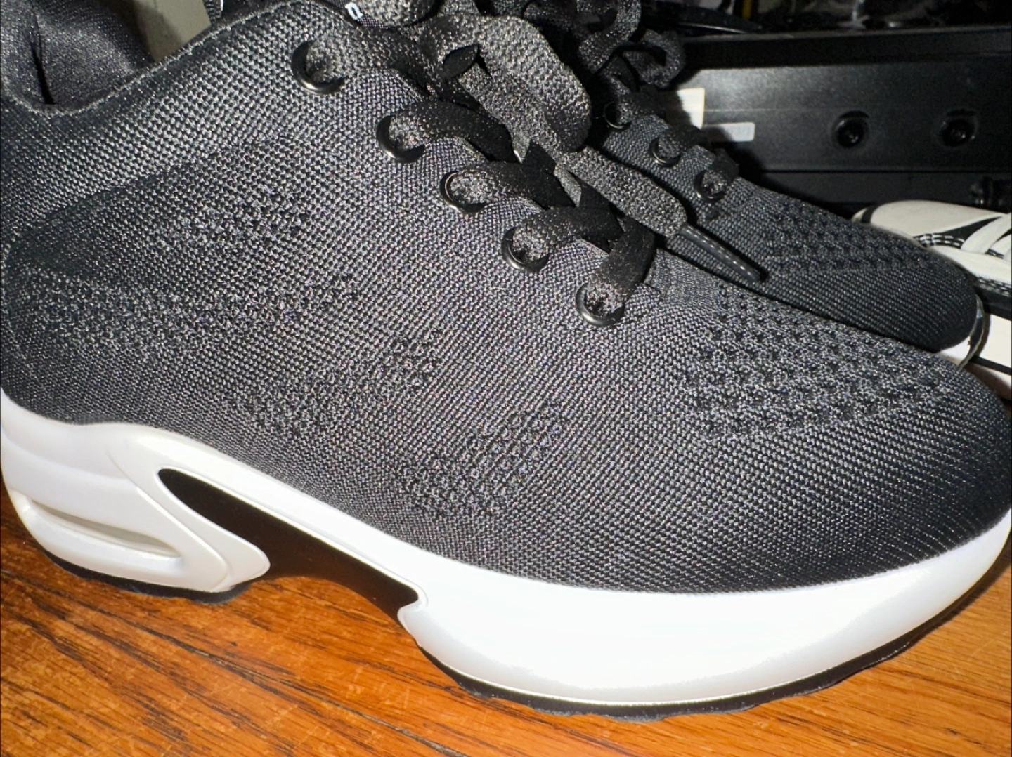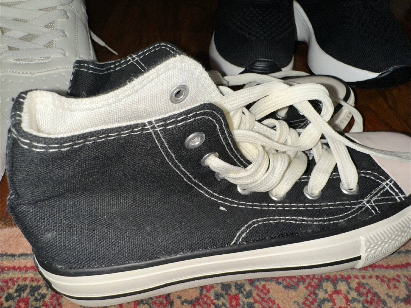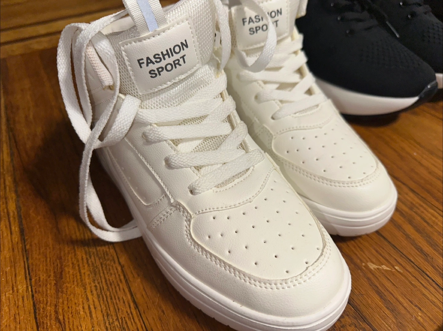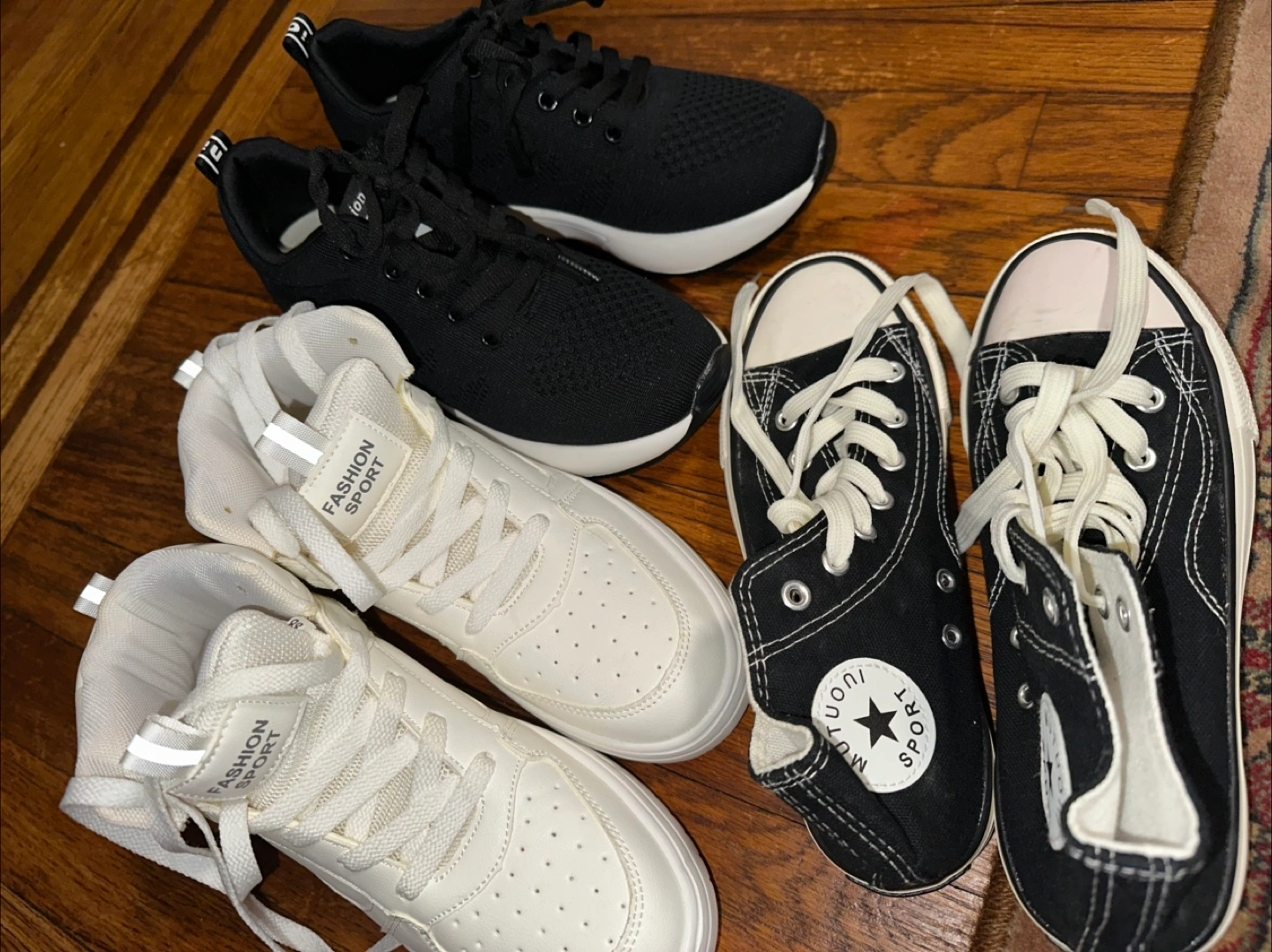 Bundle of three pairs of women's sneakers. Includes one pair of white high-top sneakers with 'Fashion Sport' branding, one pair of black knit low-top sneakers, and one pair of black canvas high-top sneakers with a star logo.