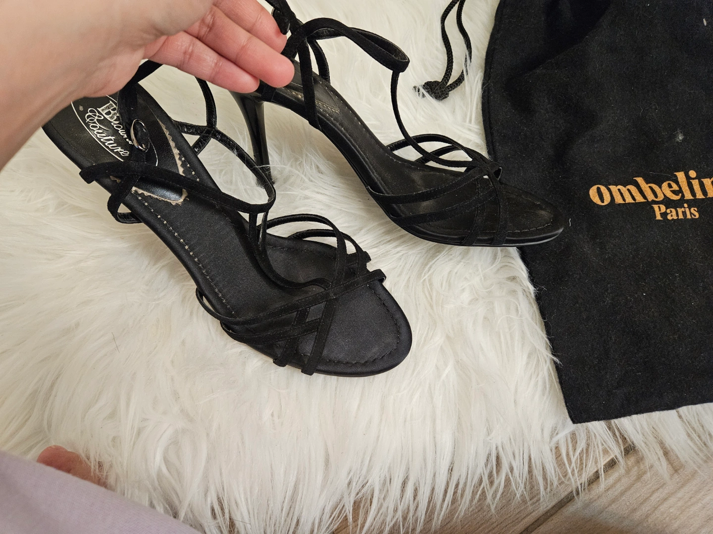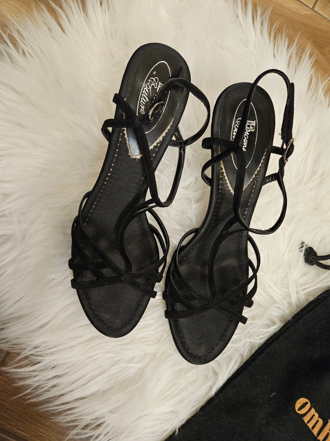Elegant black velvet high heels. Features a unique crisscross design and ankle buckle closure. Comes with a black dust bag. Size 8