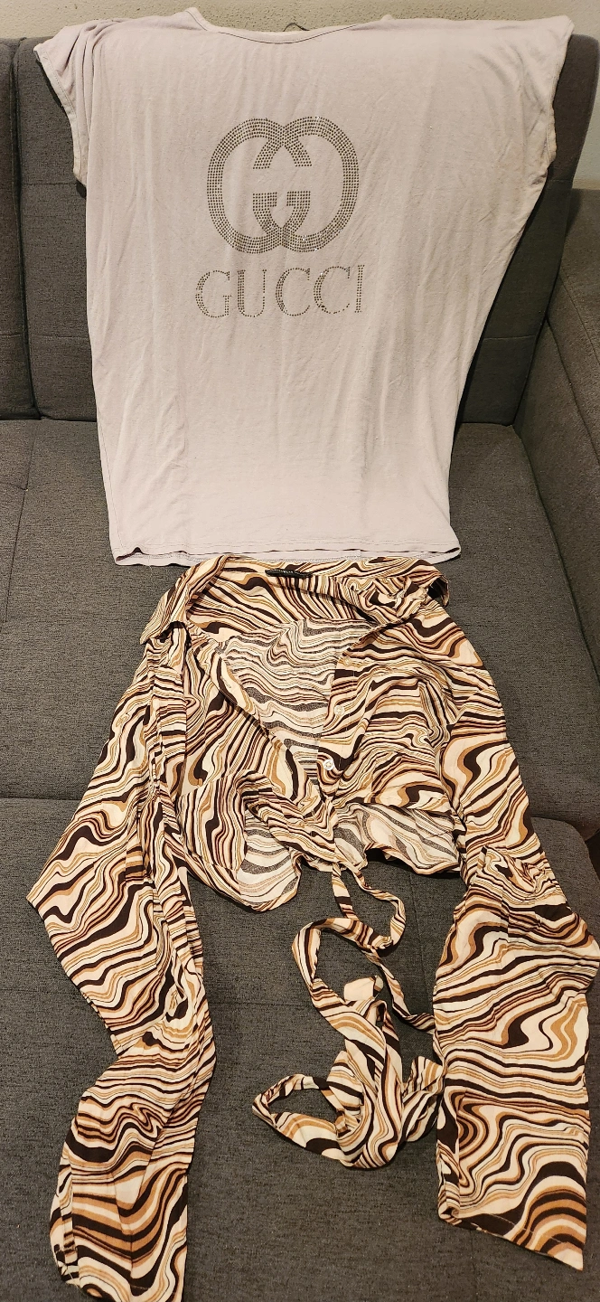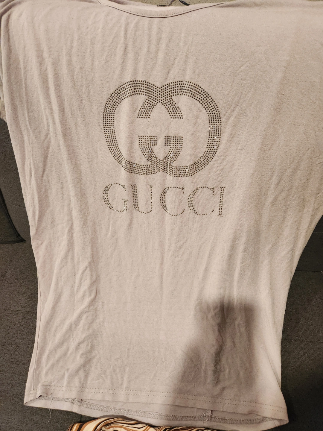 Grey "Gucci" t-shirt with rhinestone lettering is gently used and in excellent condition.