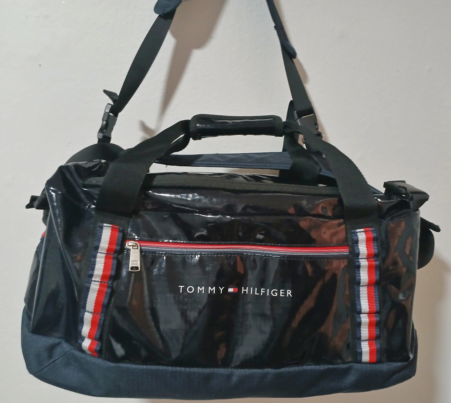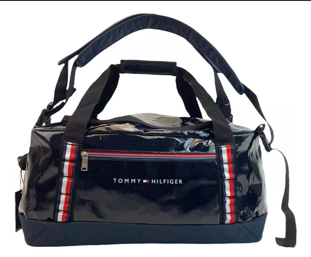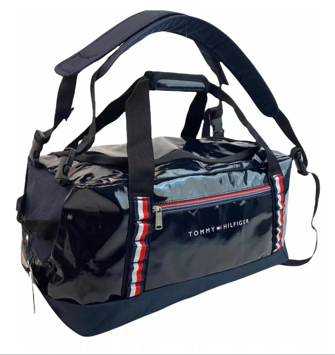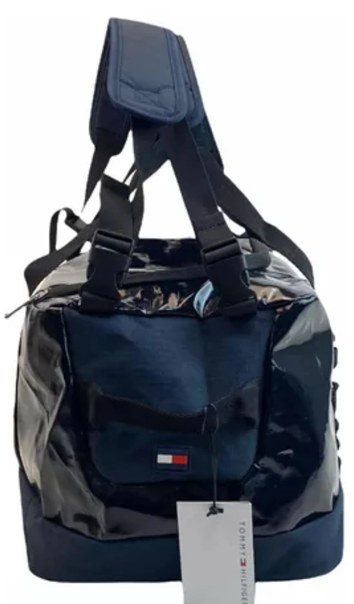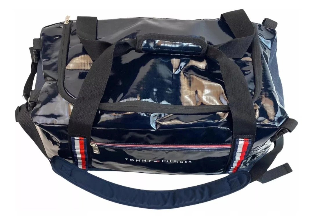 Pre-owned Tommy Hilfiger duffle bag. Shiny navy blue exterior. Features a large main compartment and multiple pockets. Includes shoulder strap and top handles. Perfect for travel or gym.