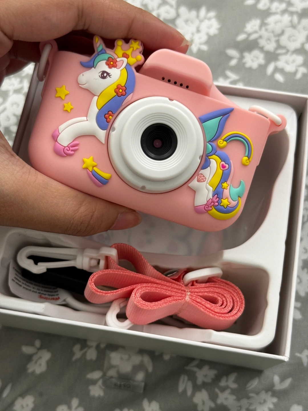 Adorable pink kids camera featuring a unicorn design. Includes a USB cable, strap, and fun stickers. Recommended for ages 3+. Great for imaginative play. Itβs new and never used. This will be the best gift for your baby girl for sure!