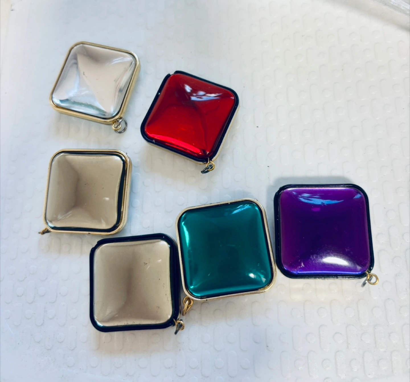 Six vintage square compacts. Gold-toned frames. Assorted colors: clear, red, green, purple, and champagne. Great for DIY jewelry or artwork