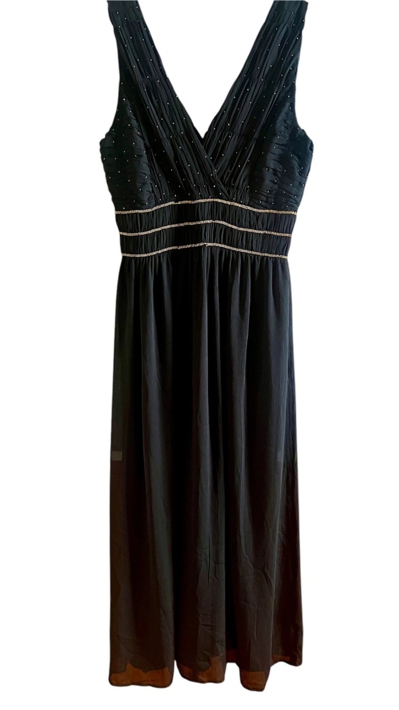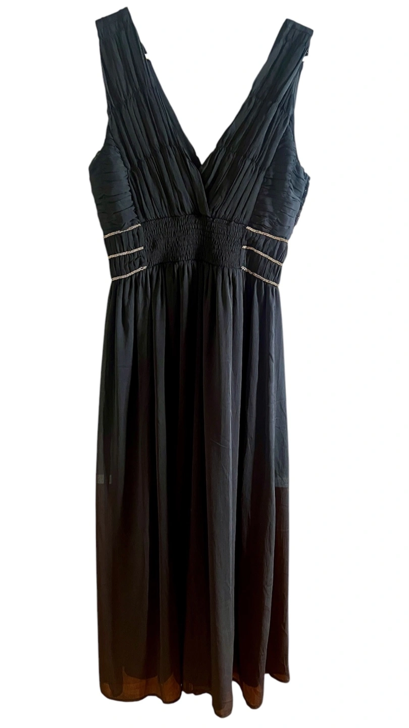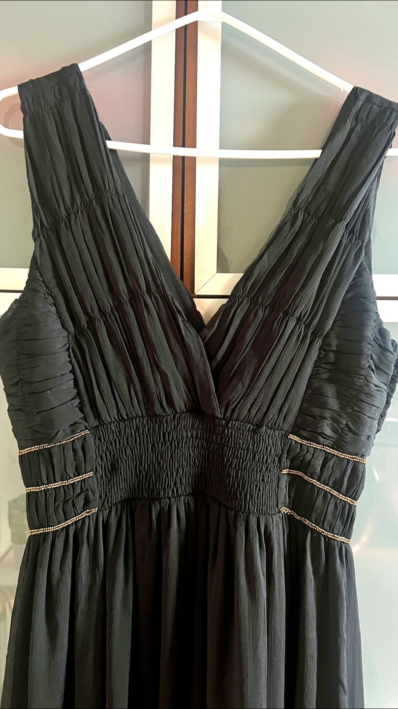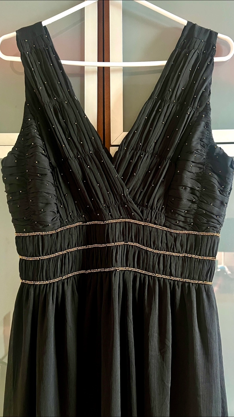 Elegant black dress. Features a V-neck, sleeveless design, pleated bodice, and gold beading detail. Flowy skirt. Perfect for special occasions.