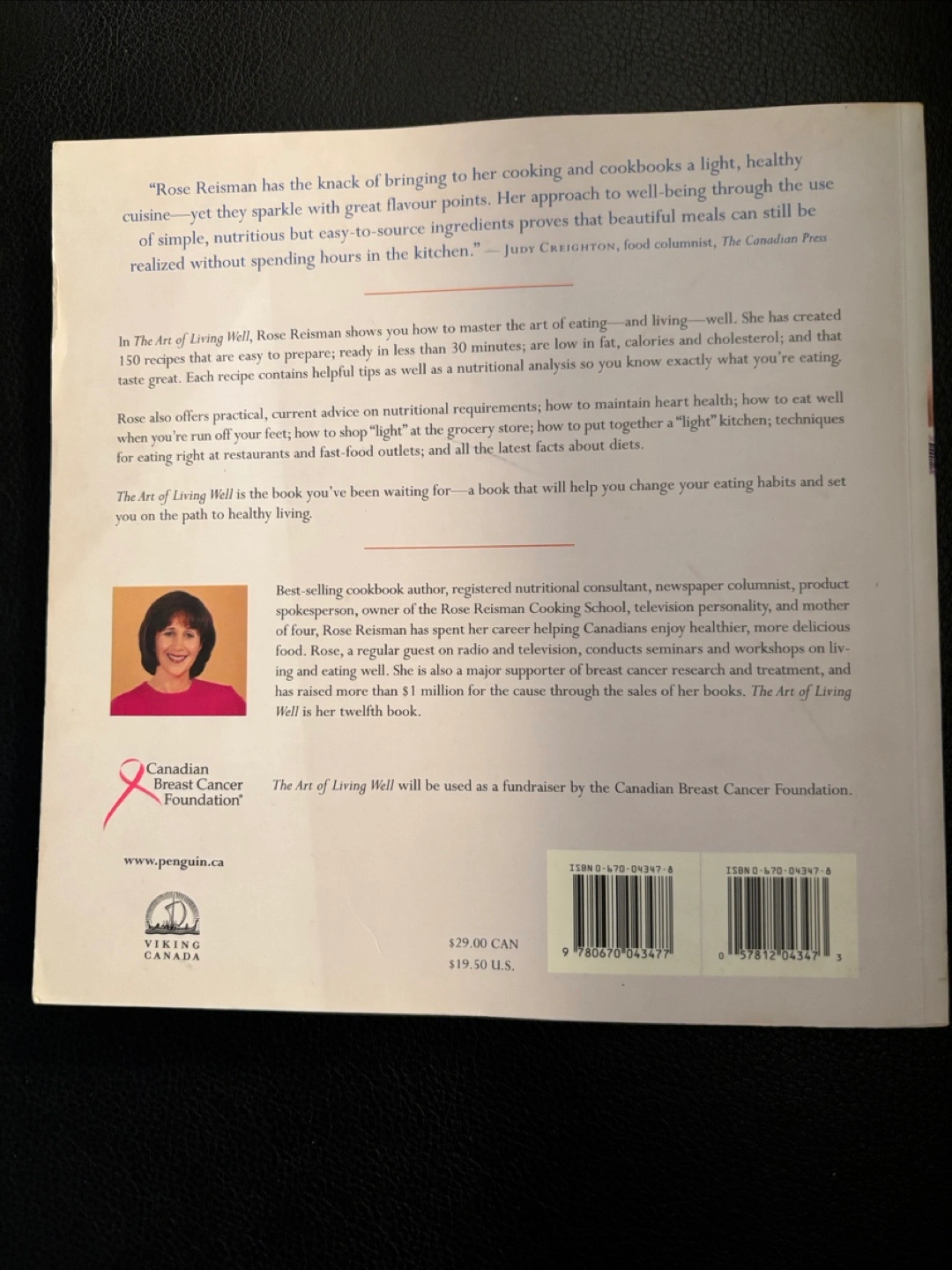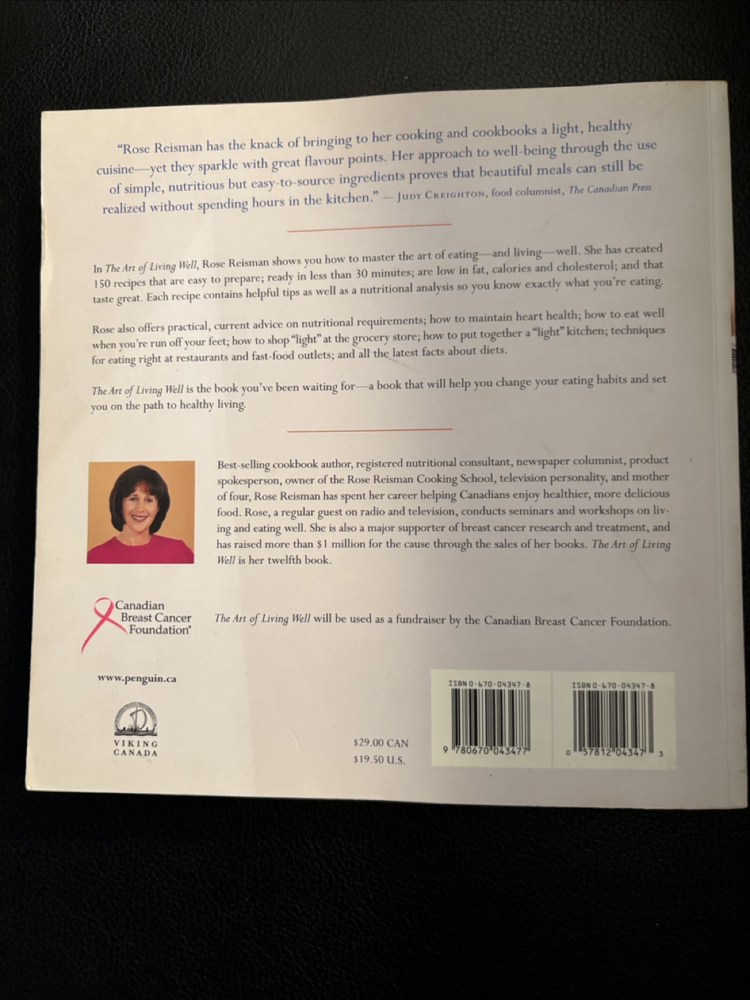 Cookbook features light cooking and eating recipes. Helpful tips on nutritional analysis and maintaining a healthy lifestyle. Includes information on how to maintain heart health, how to shop for nutritional groceries, and how to put together a light kitchen. Proceeds benefit the Canadian Breast Cancer Foundation. From a pet and smoke free home. Pickup only available n the St Lawrence market area of downtown Toronto. Cash only.