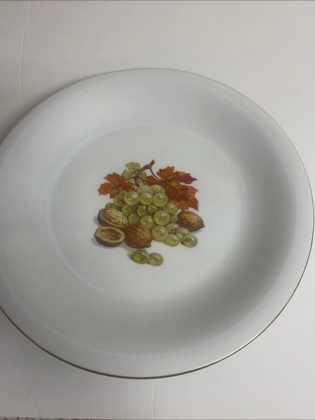 Set of eight vintage dessert plates. Features various fruits. Gold trim. Excellent condition.