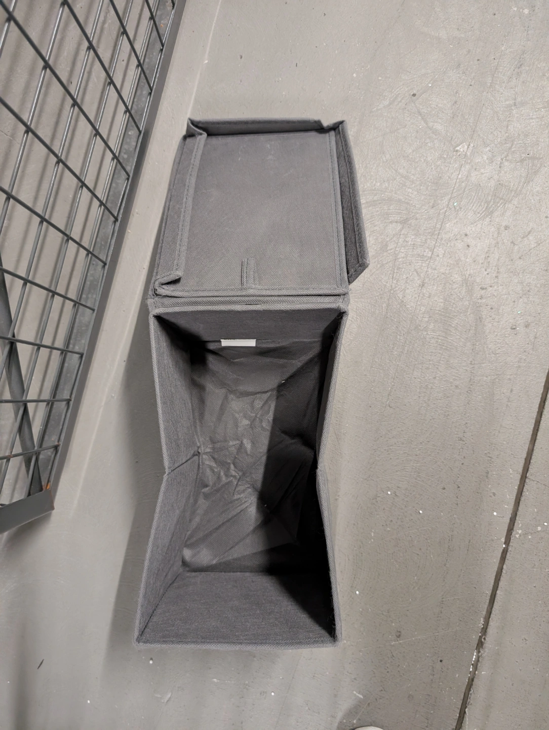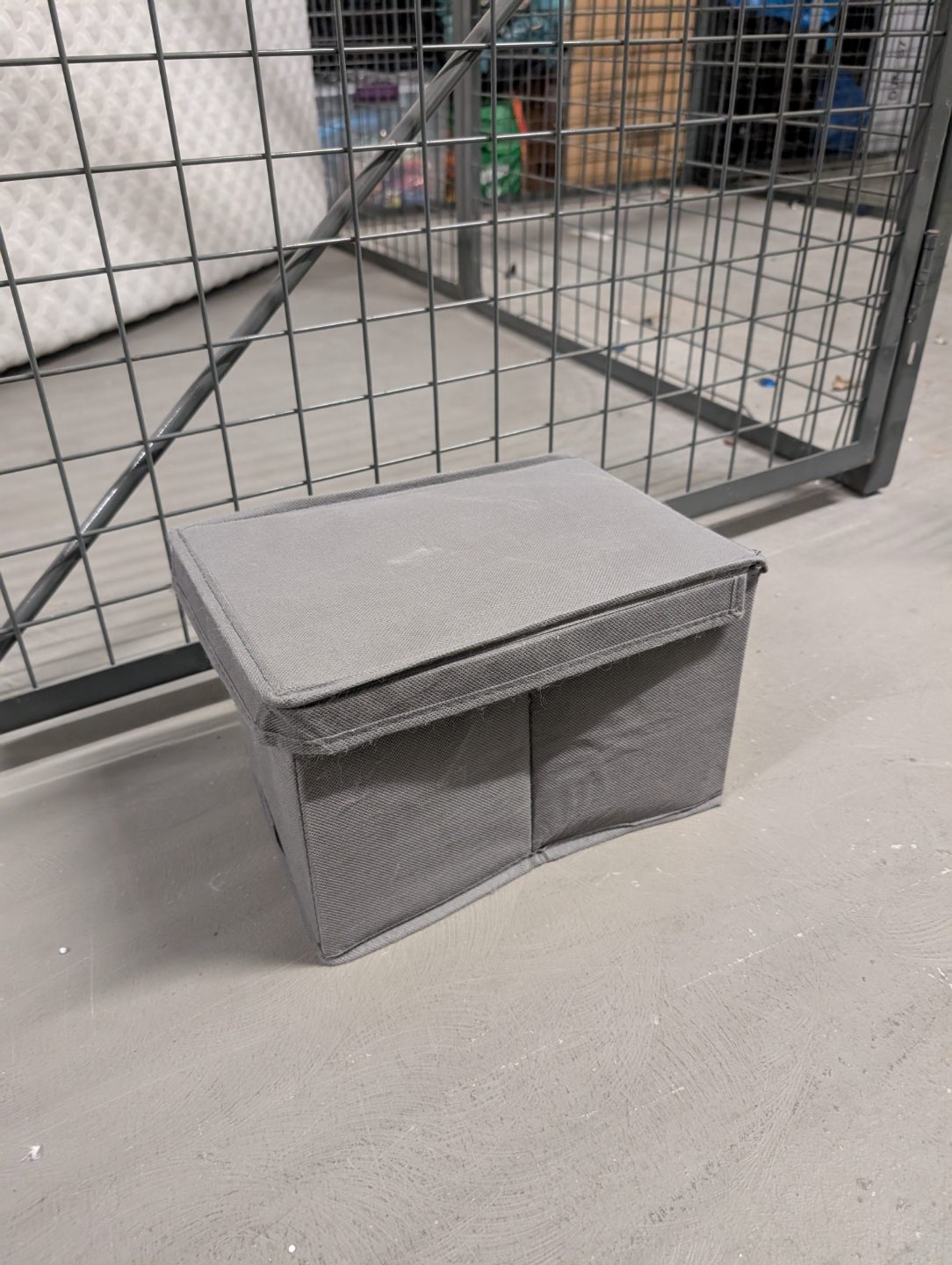 Collapsible grey fabric storage bin. Perfect for organizing closets or shelves. Small size, ideal for smaller items.