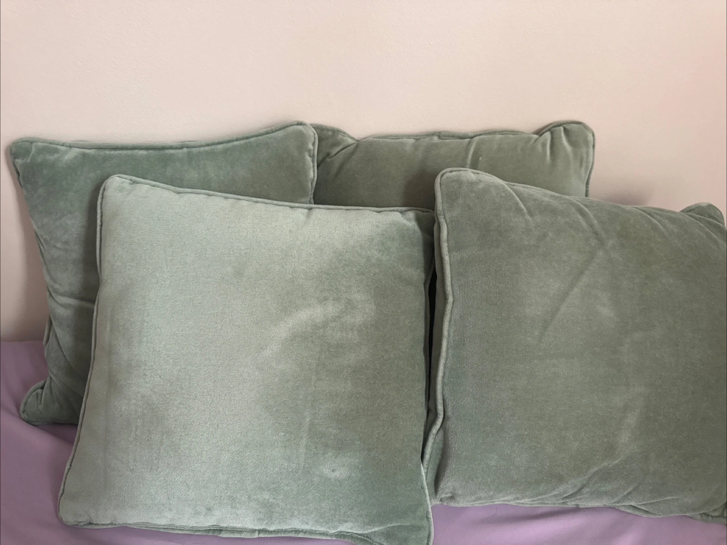Four throw pillows. With three pink cushion covers. Great for adding colour and texture to your living space. Perfect for couches or beds.