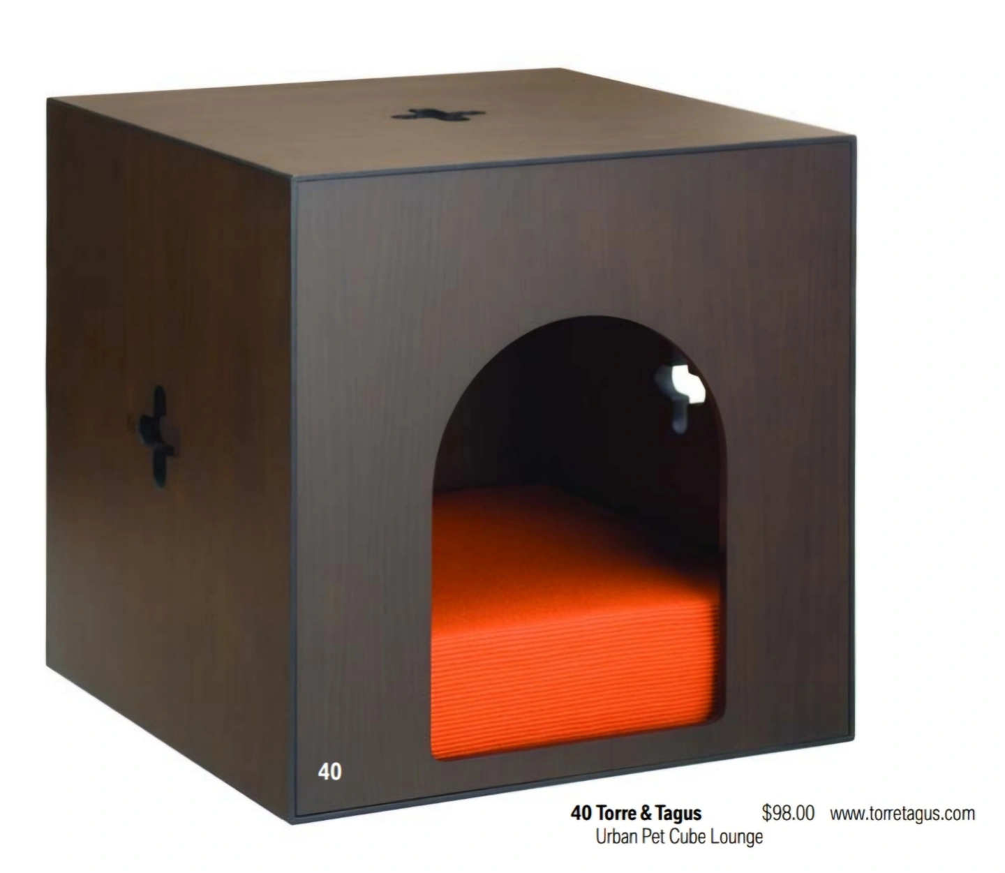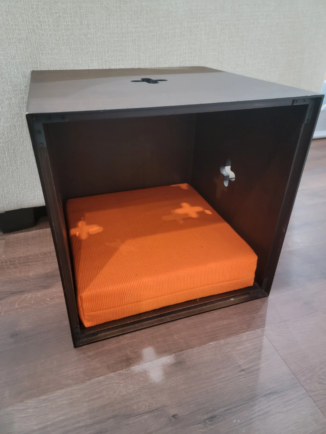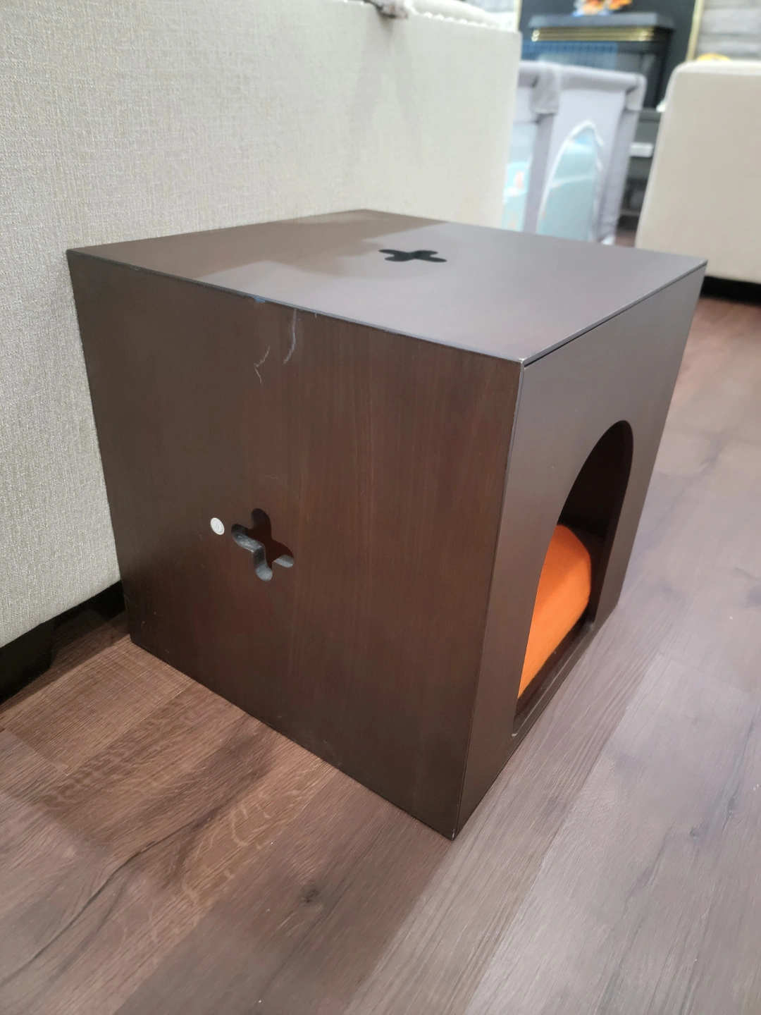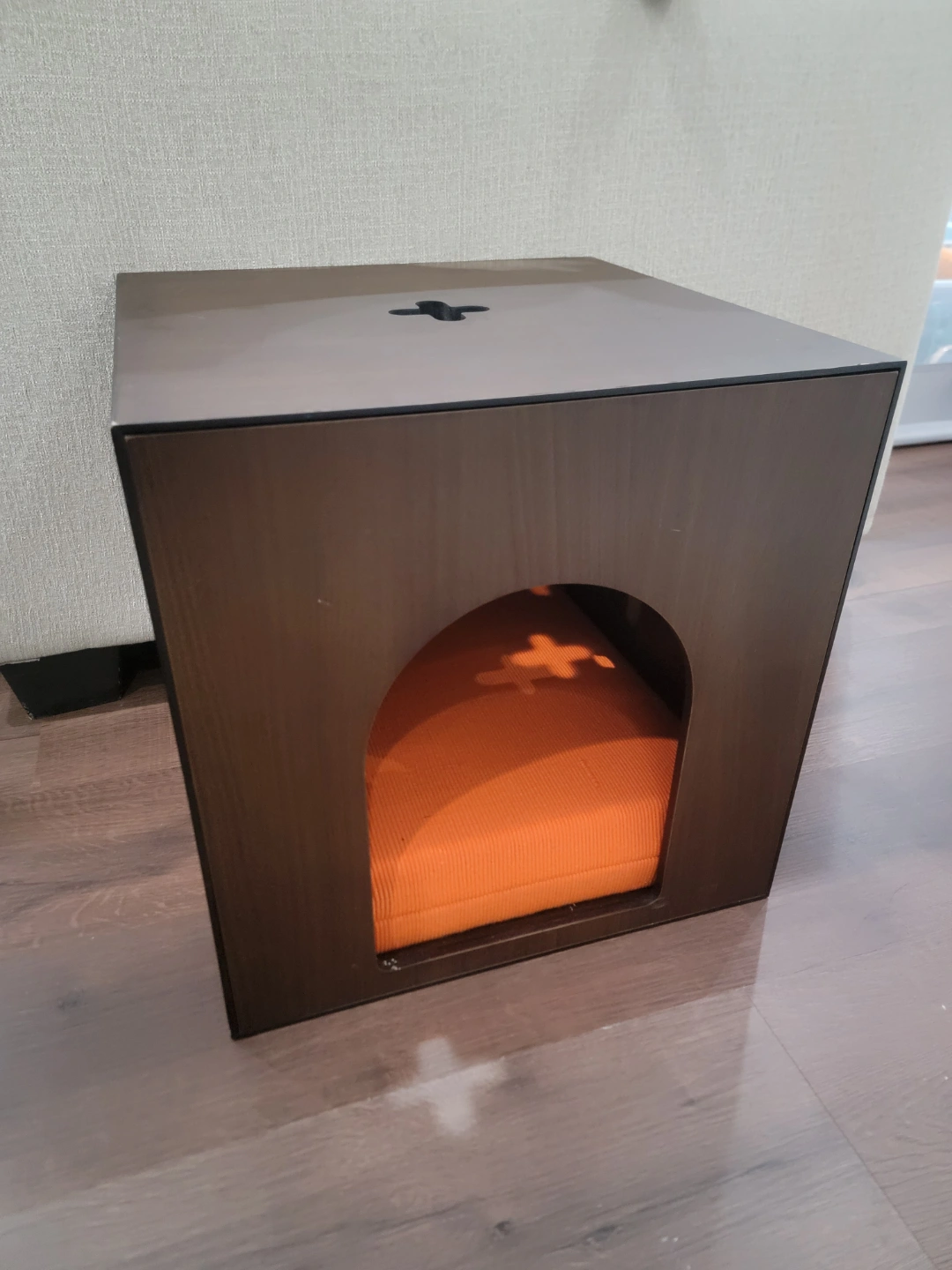Dark brown wooden pet bed. Features an arched opening and orange cushion. Small cut-outs on the sides. Stylish and modern design.