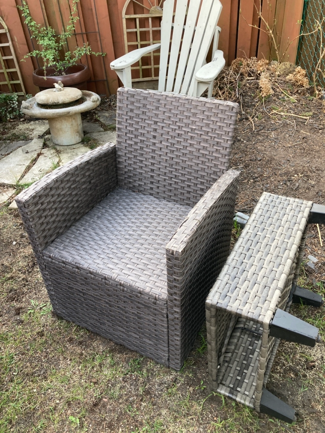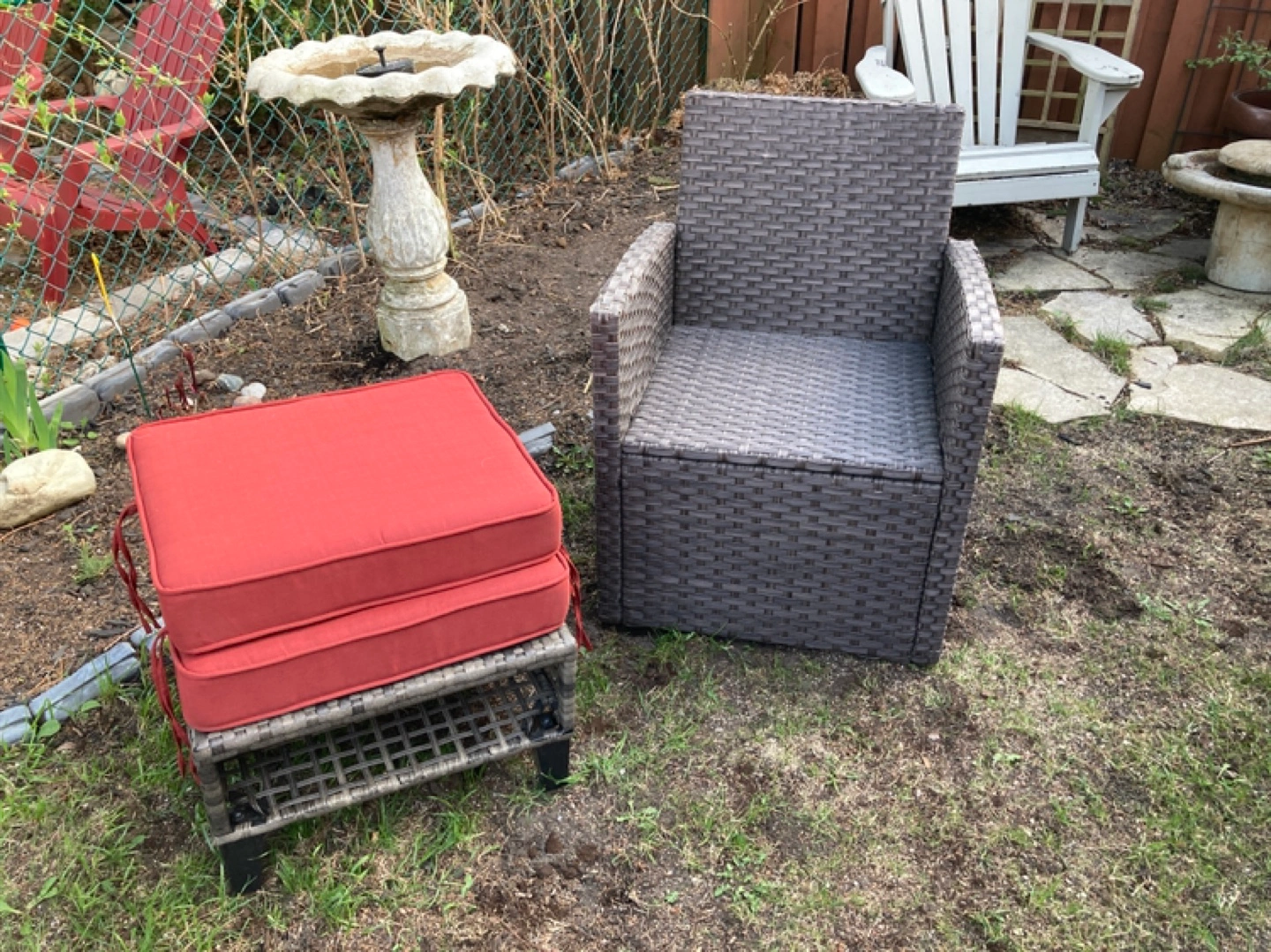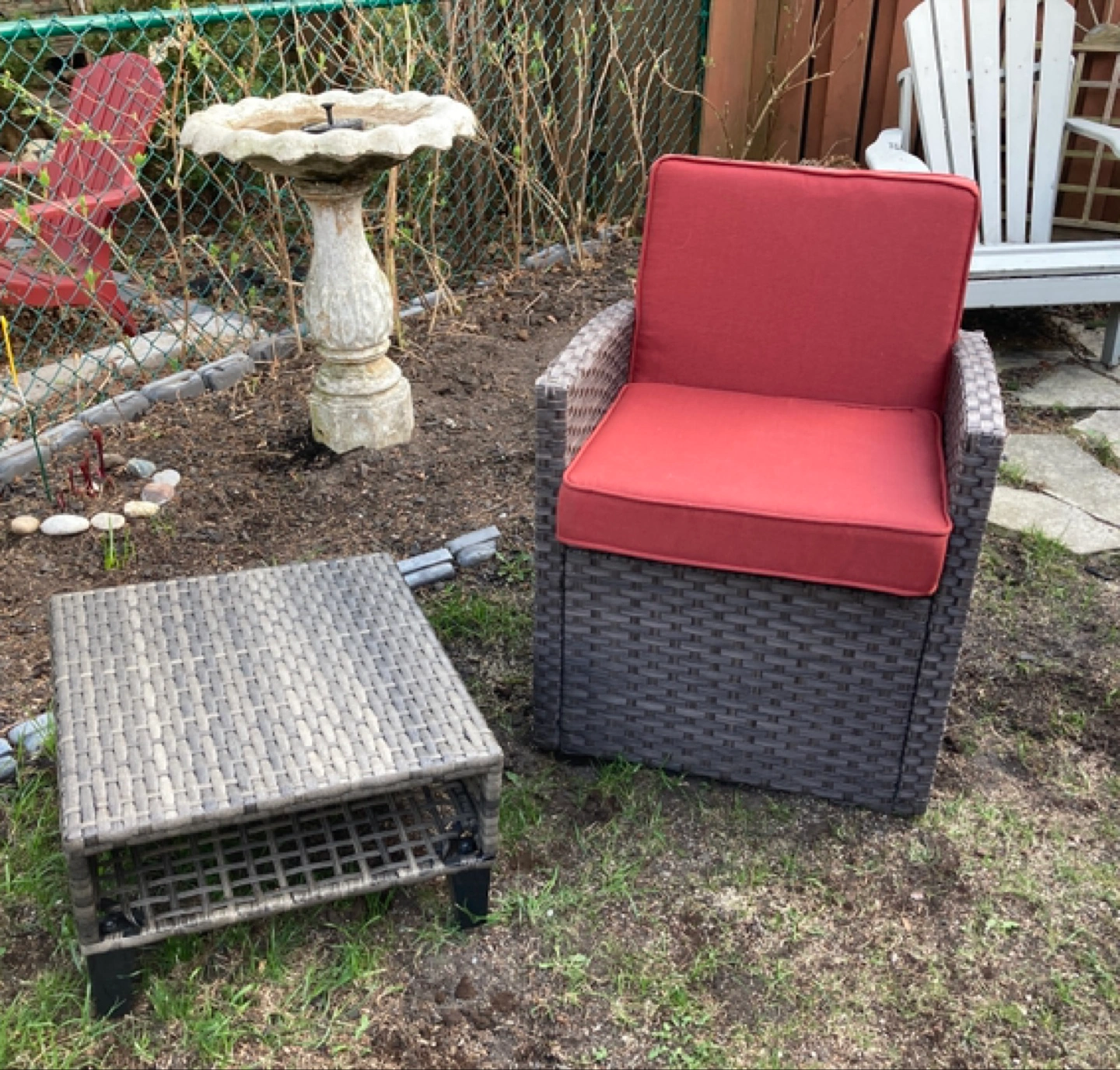 Selling our 2 piece resin wicker patio chair with burgundy cushions.( no rips always stored indoor) and small side table.