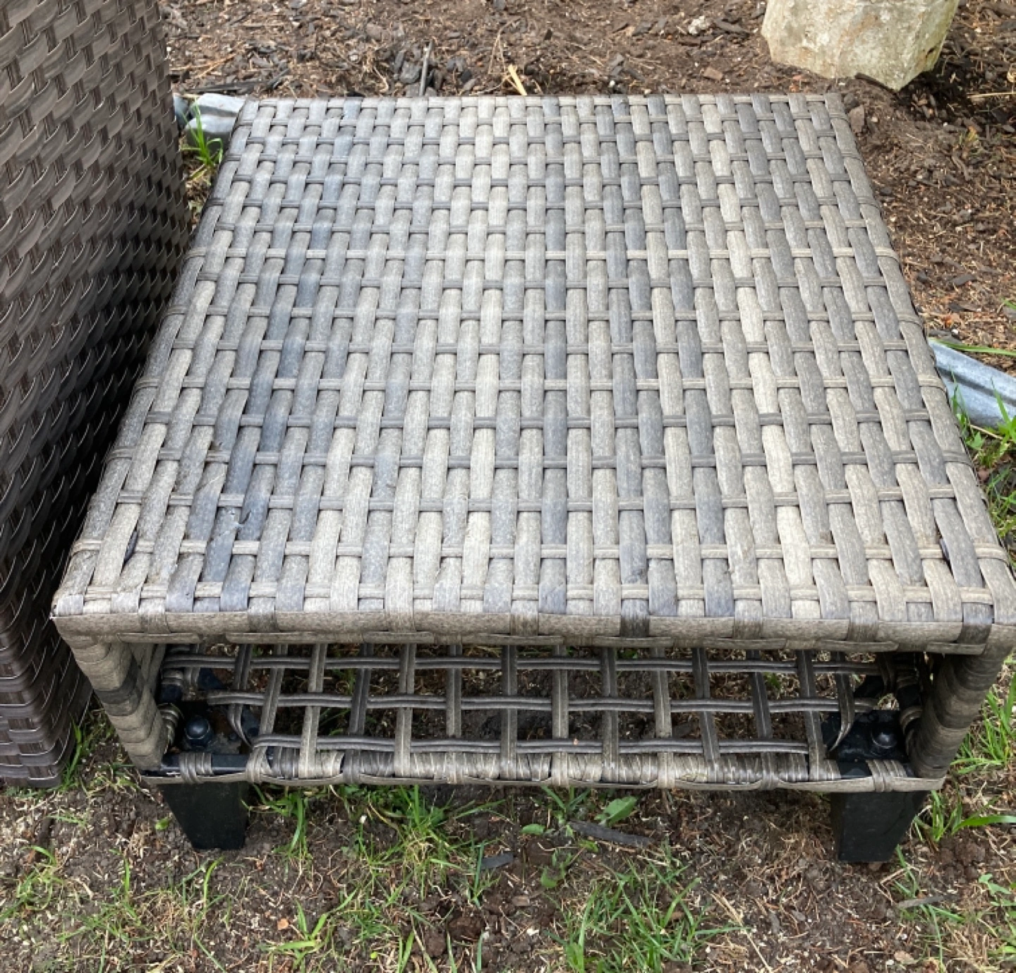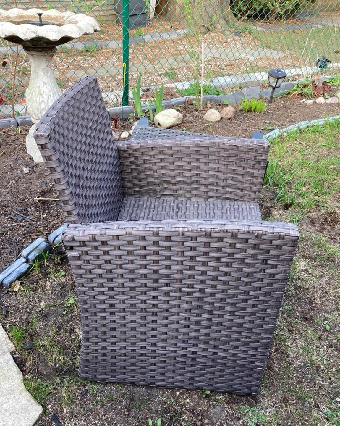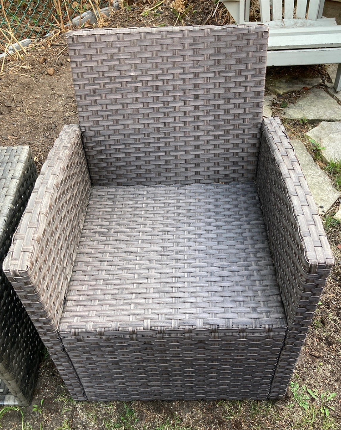 Selling our 2 piece resin wicker patio chair with burgundy cushions.( no rips always stored indoor) and small side table.