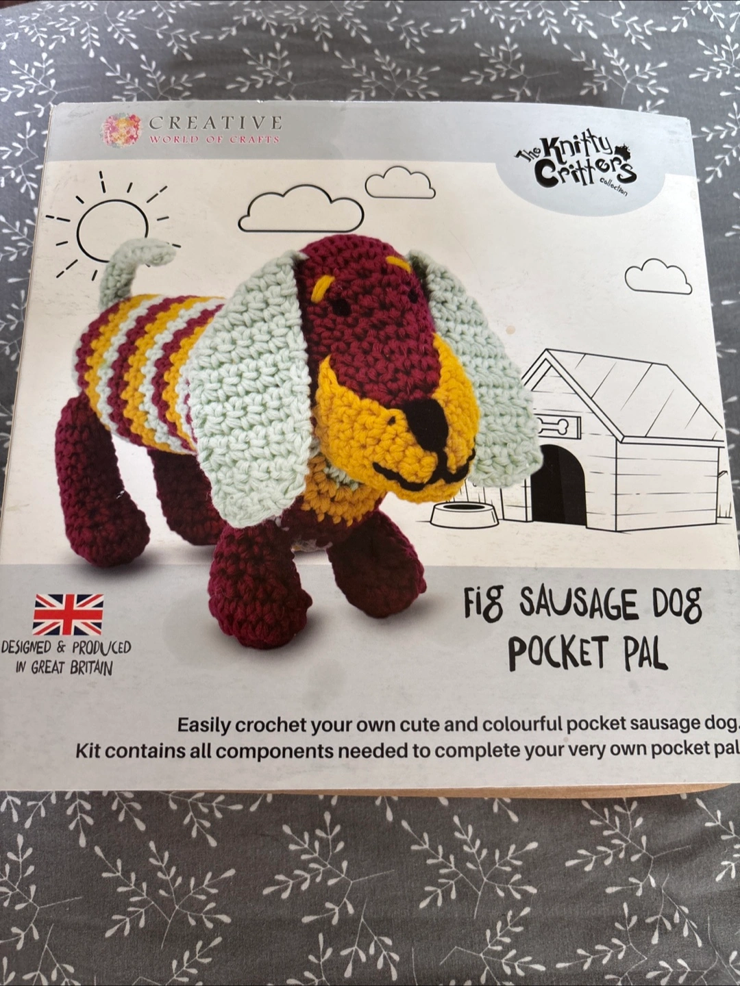 Crochet kit. Make your own cute and colourful pocket sausage dog. Kit includes all components. Designed and produced in Great Britain.