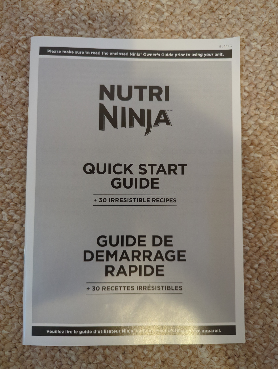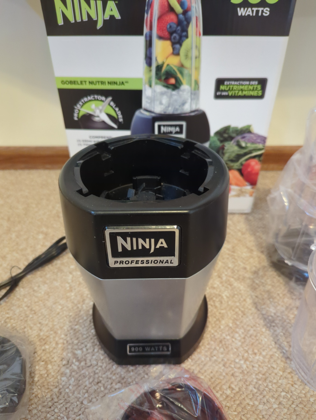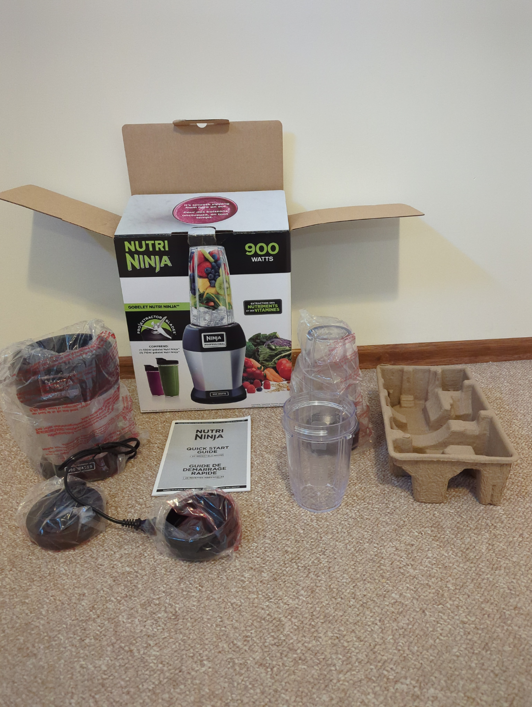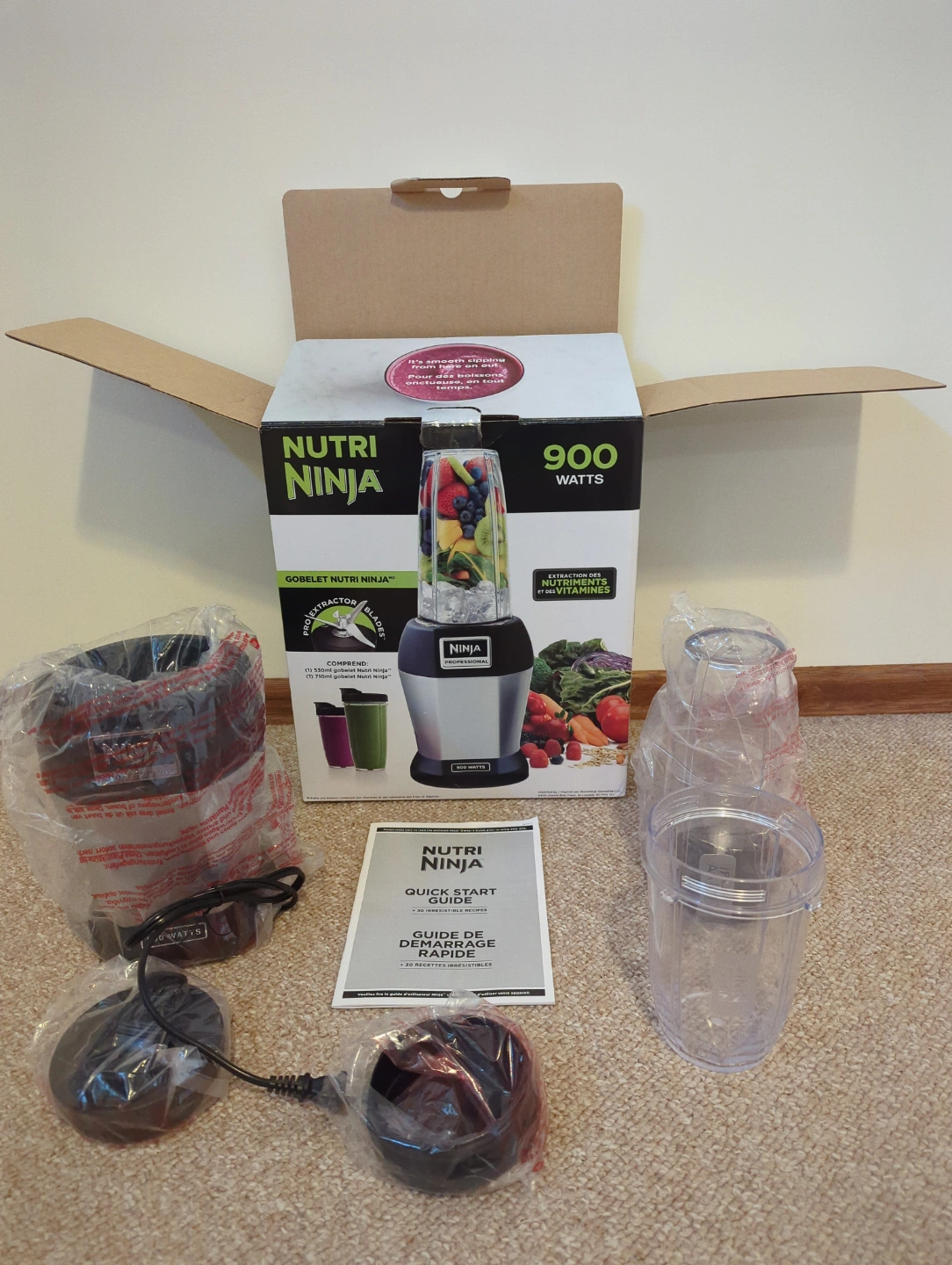New Nutri Ninja 900-watt blender. Includes multiple cups and a quick start guide. Powerful motor, ideal for smoothies and more. Never used.