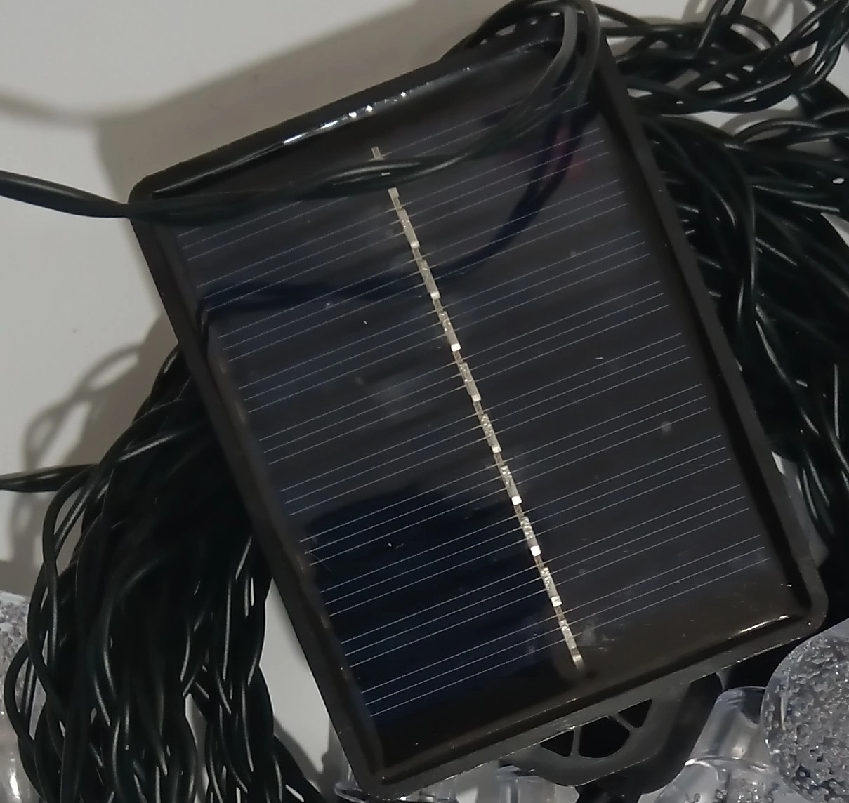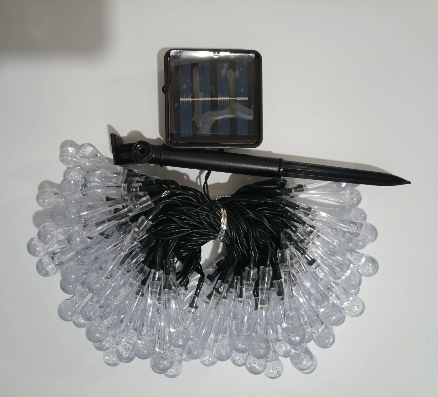 Brand New solar powered string lights. Features teardrop shaped bulbs. white or warm white.Includes solar panel and ground stake. Perfect for patios or gardens. also can be used indoors if you place the solar panel in a sunny location. 40 feet with 8 modes