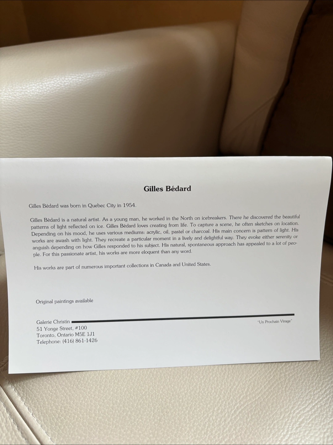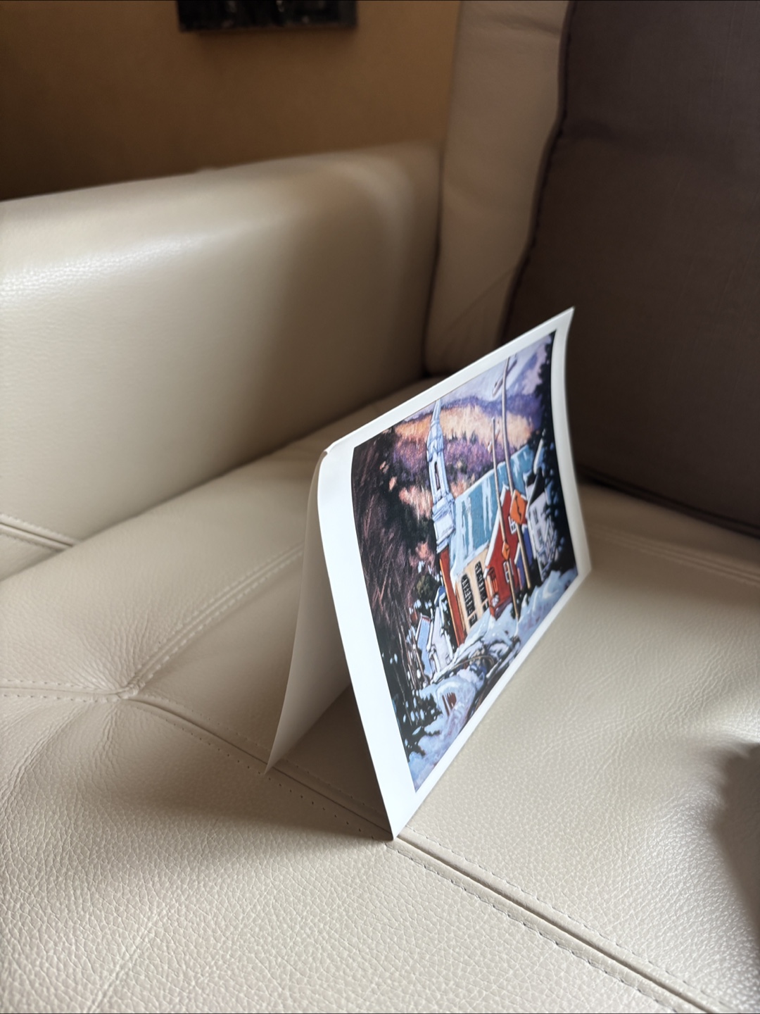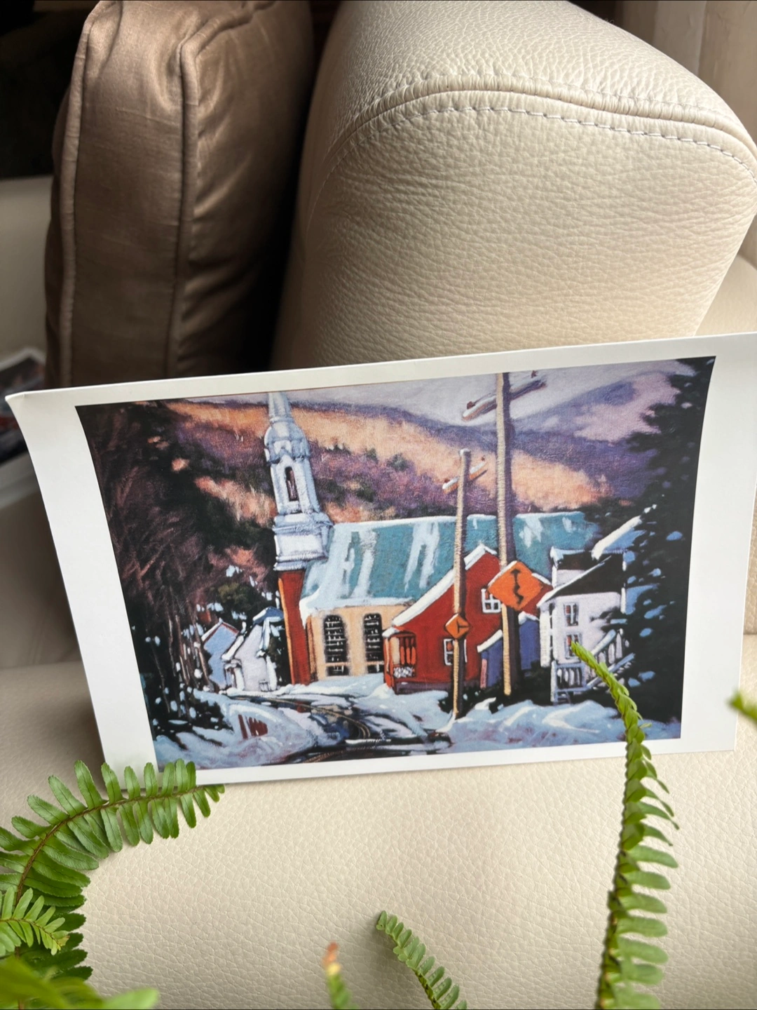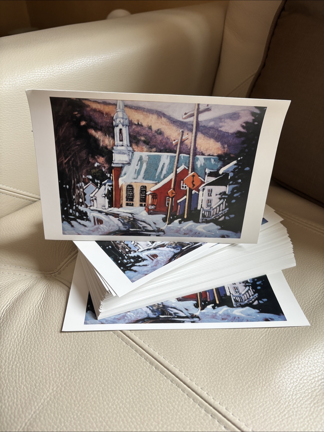 Greeting cards (no envelopes) by artist Giilles Bédard of a winter village scene. Snowy landscape, church, houses. Beautiful artwork, perfect for framing or gifting as a greeting card. .50 cents each. I have lots so if you buy more than ten I can discount further. Size is 9 x 6 inches.