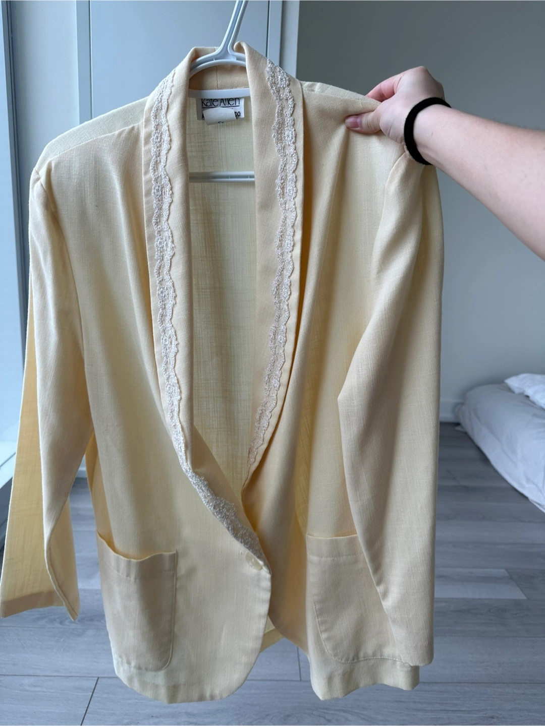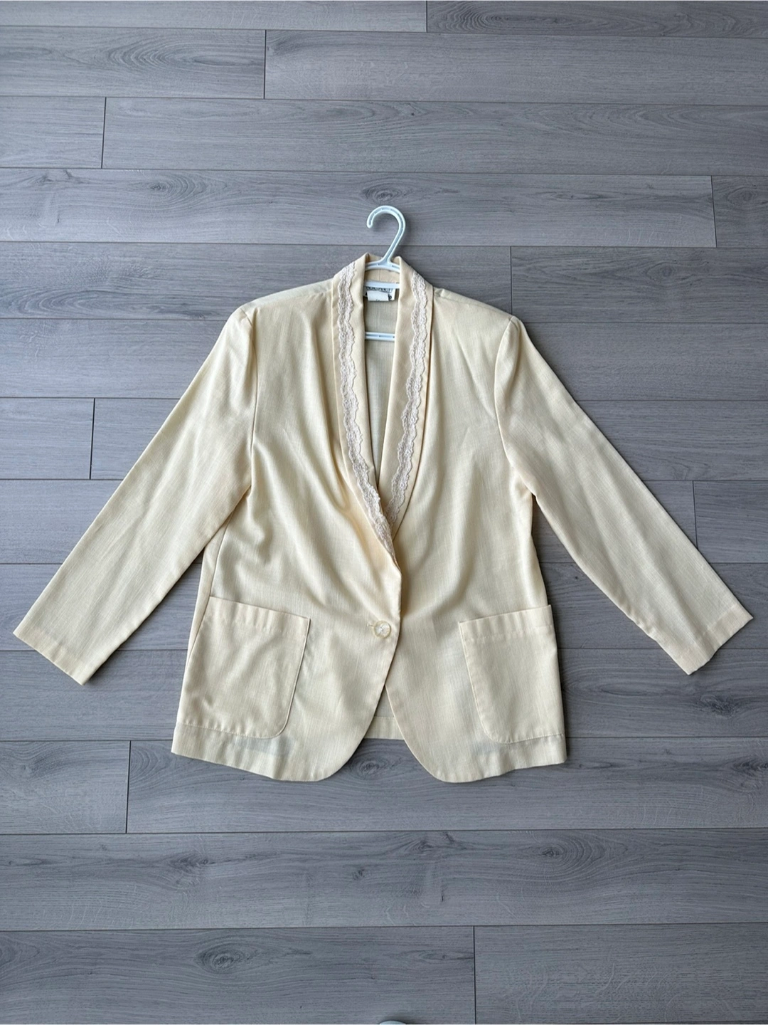 🧈Beautiful butter yellow vintage blazer with lace detailing on the collar. Relaxed fit, easy to dress up or down!
