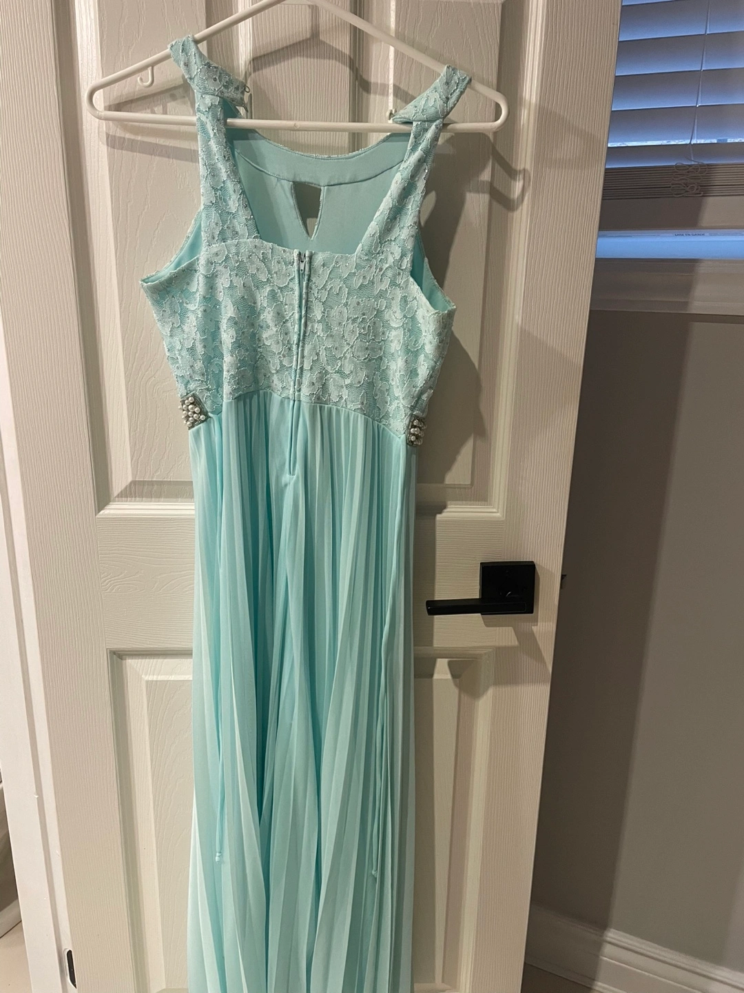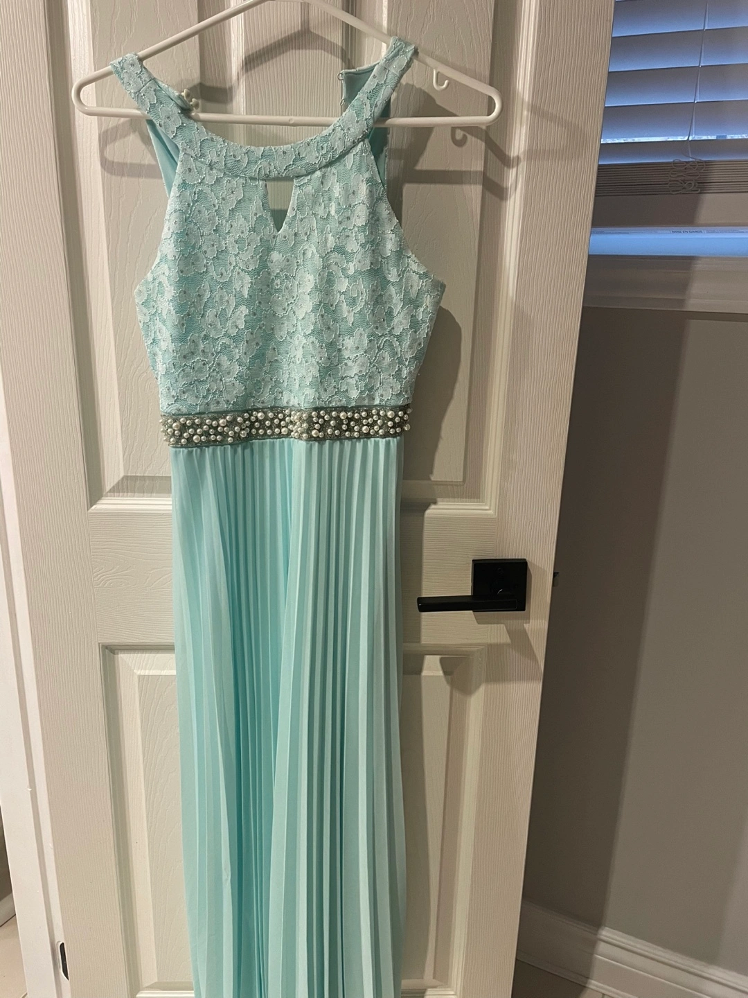Beautiful mint green maxi dress. Features a pleated skirt and a lace bodice with pearl embellishments. Zipper closure in the back. Perfect for special occasions.