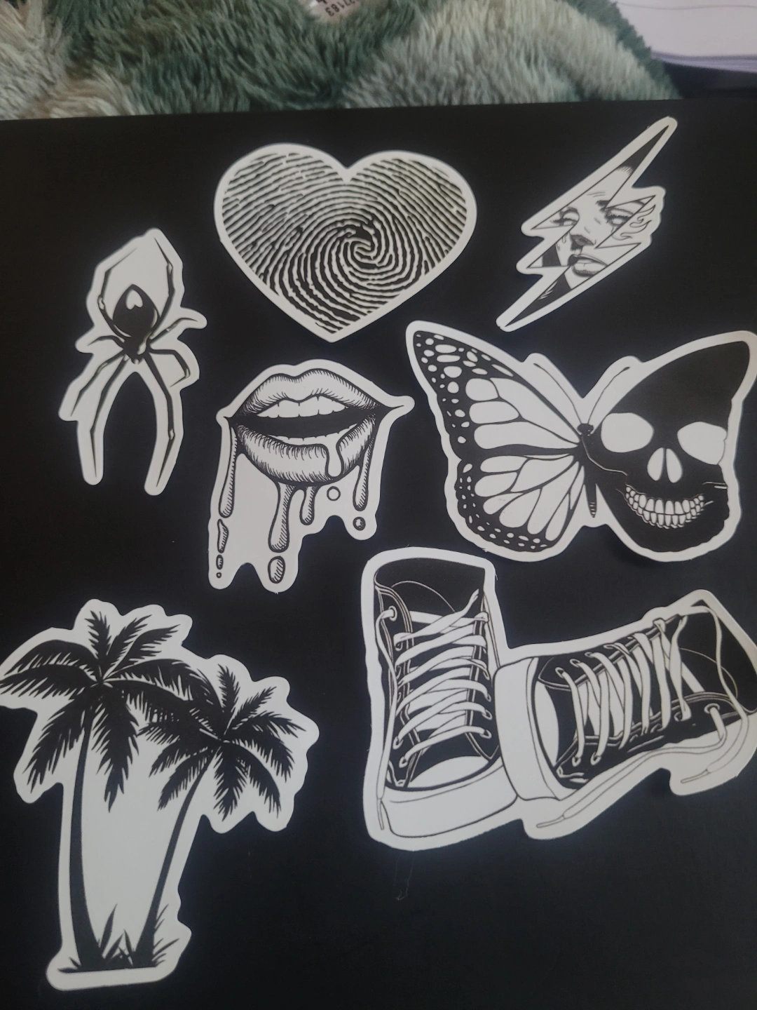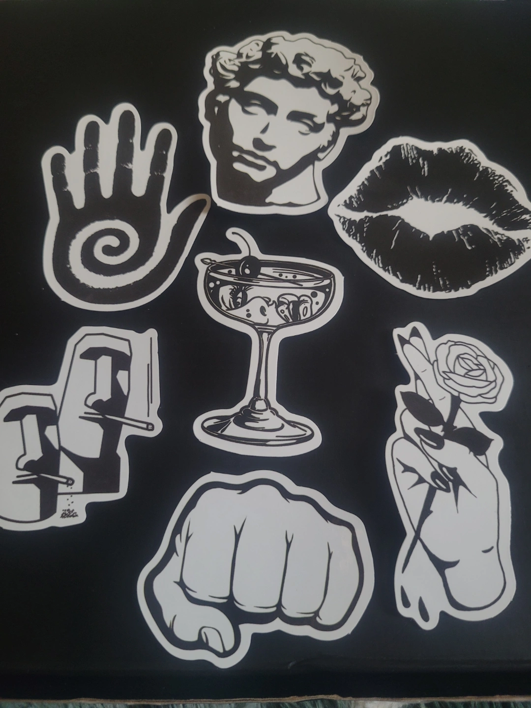 Set of 36 unique stickers. Various designs including skulls, hearts, butterflies, and other edgy graphics. Black and white aesthetic. Perfect for laptops, water bottles, or Journaling.