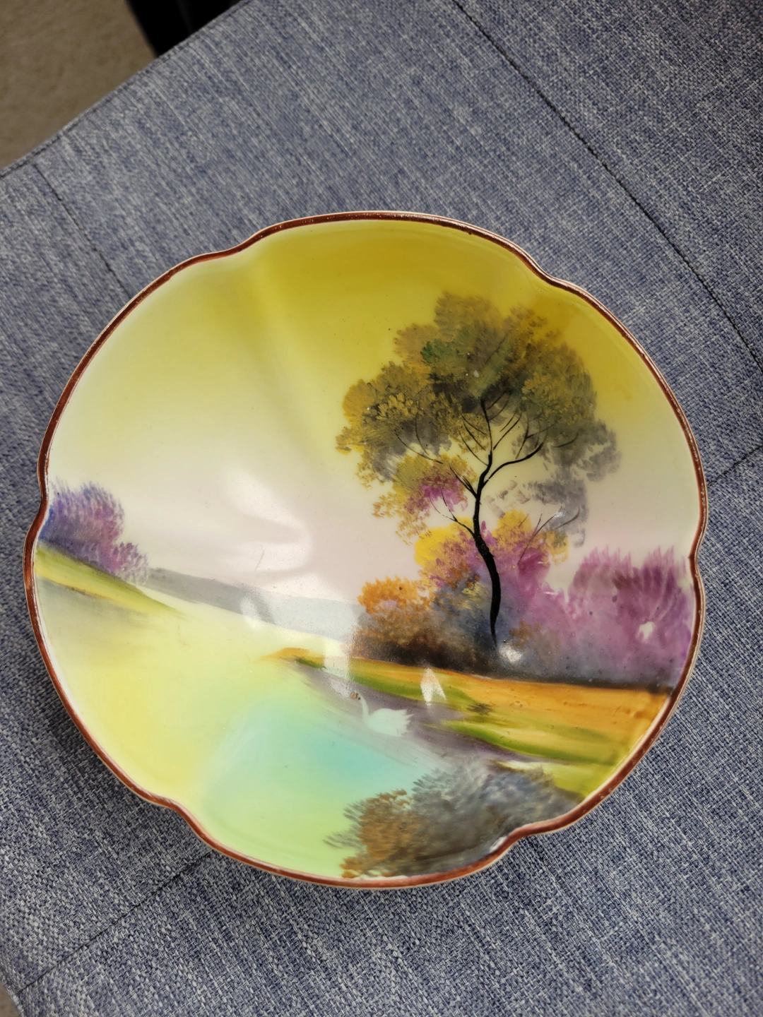 Beautiful vintage bowl. Hand-painted landscape design. Scalloped edges. Three small feet. Made in Japan. pick up near Fanshawe and Highbury