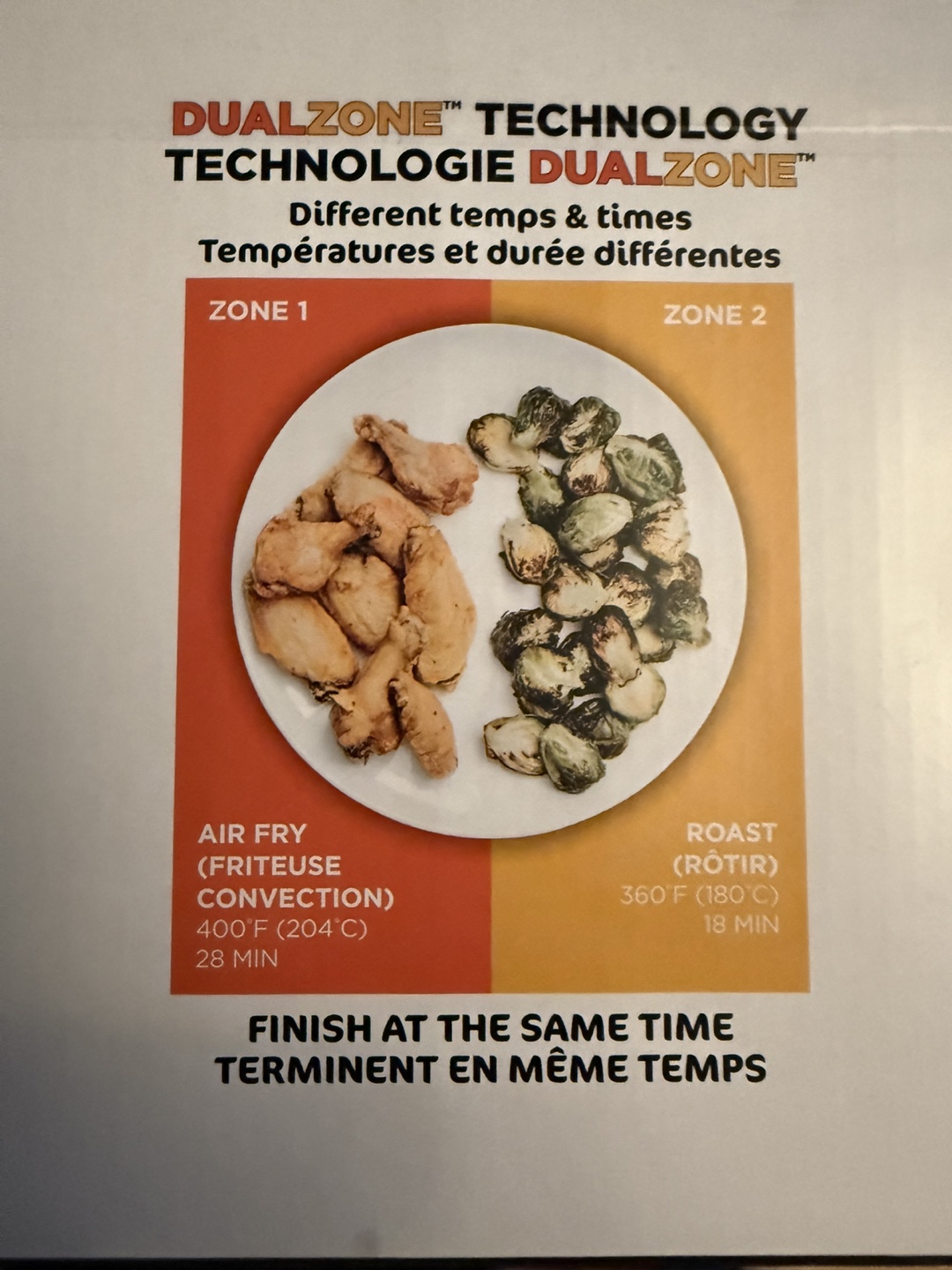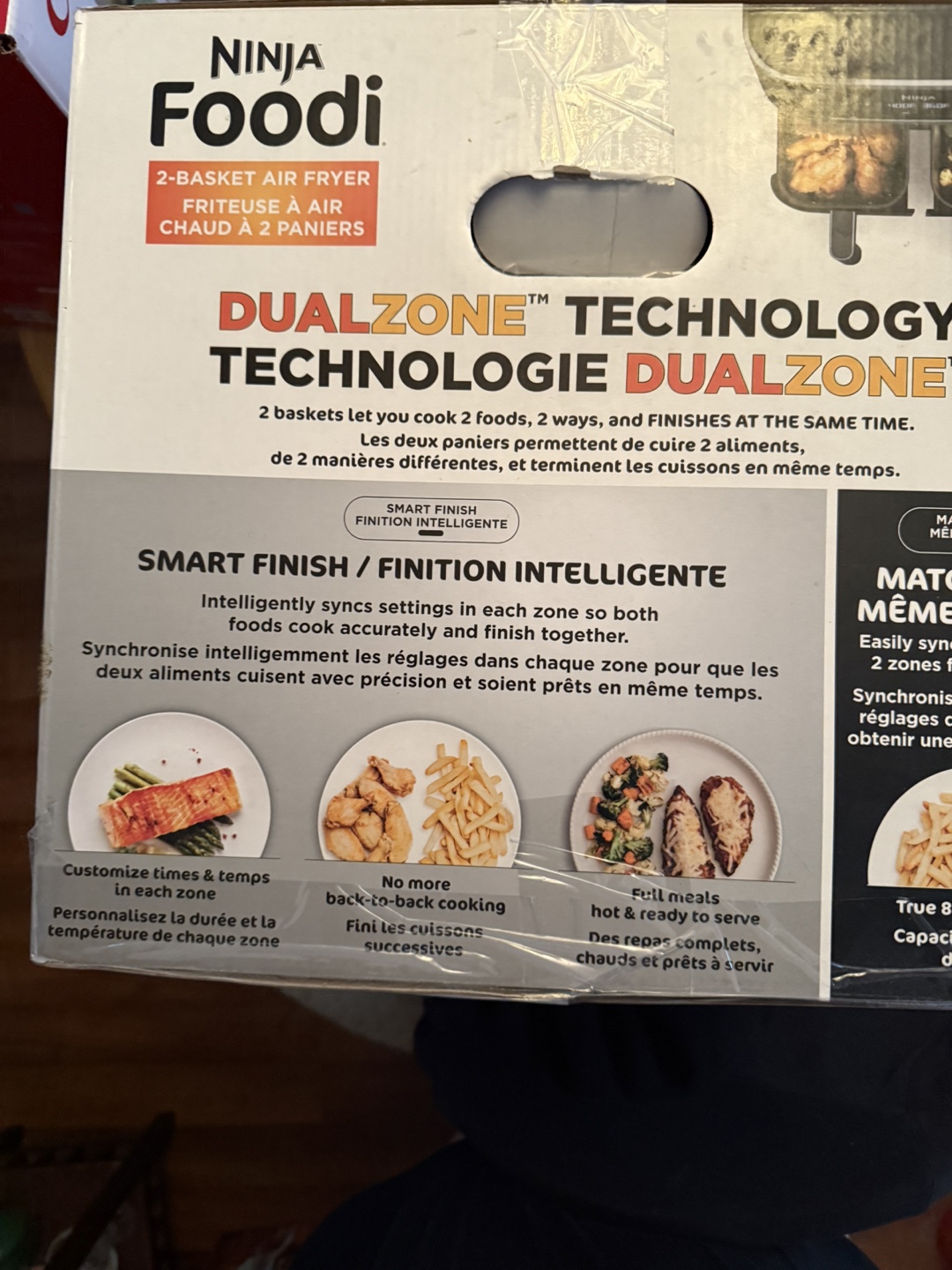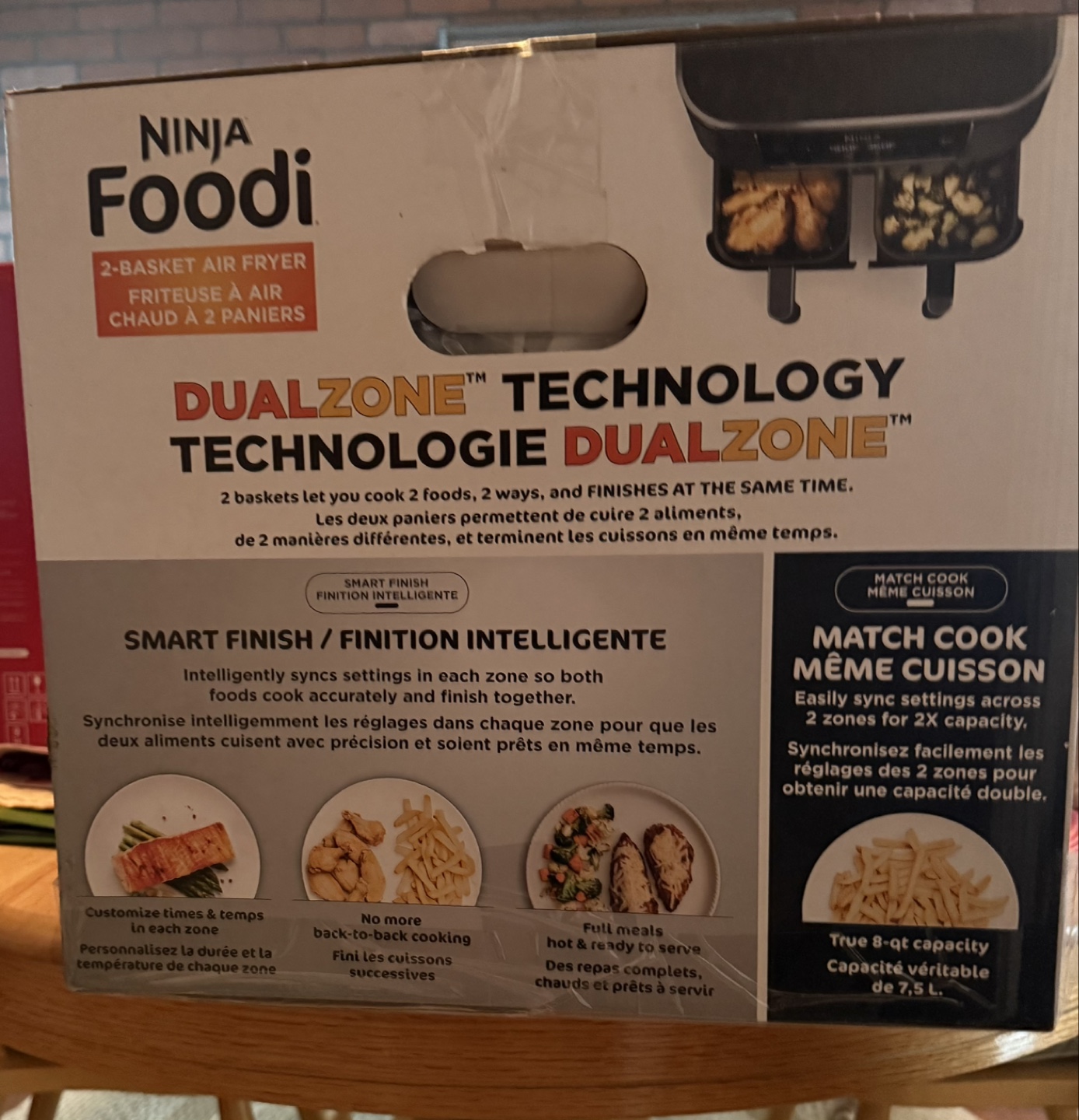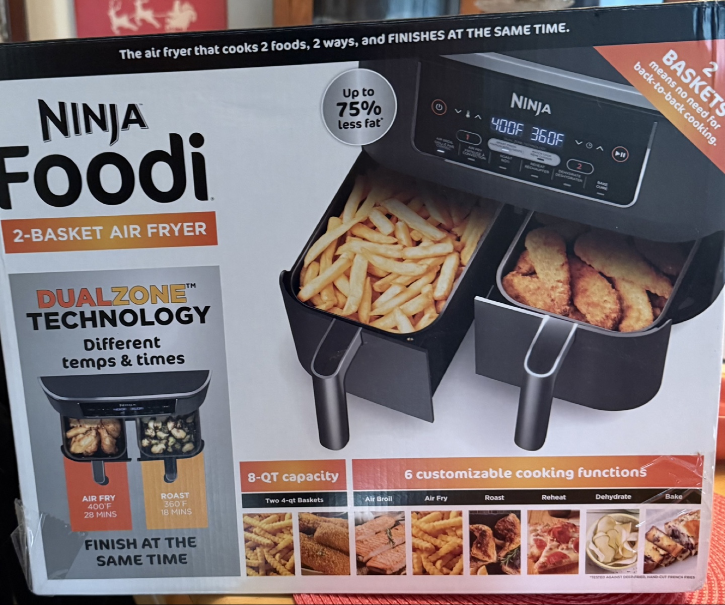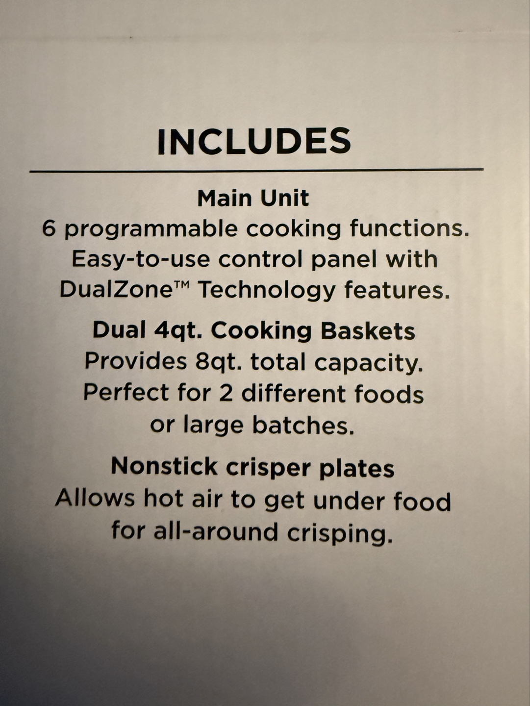 8-qt capacity air fryer. DualZone™ technology cooks two foods, two ways, at the same time. Six customizable cooking functions. Includes two 4-qt baskets and nonstick crisper plates.