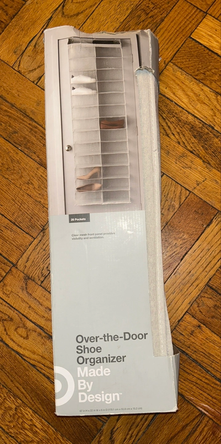 1000+New, in box Made By Design Over-the-door shoe organizer. 26 pockets. Clear mesh front panel provides visibility. Great for closets and entryways. Organize shoes and other small items. Comes with hooks. Never used. Sold for $36