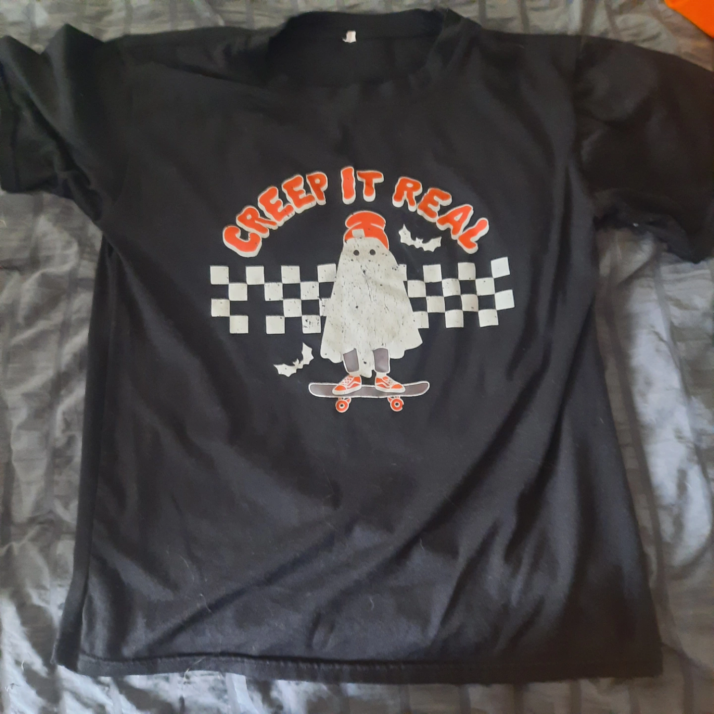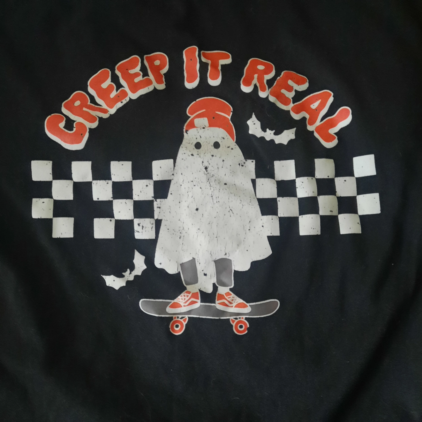 Black short sleeve t-shirt. Features a graphic design of a skateboarding ghost with the text "Creep It Real". Cool Halloween-themed design. Great for casual wear. size medium