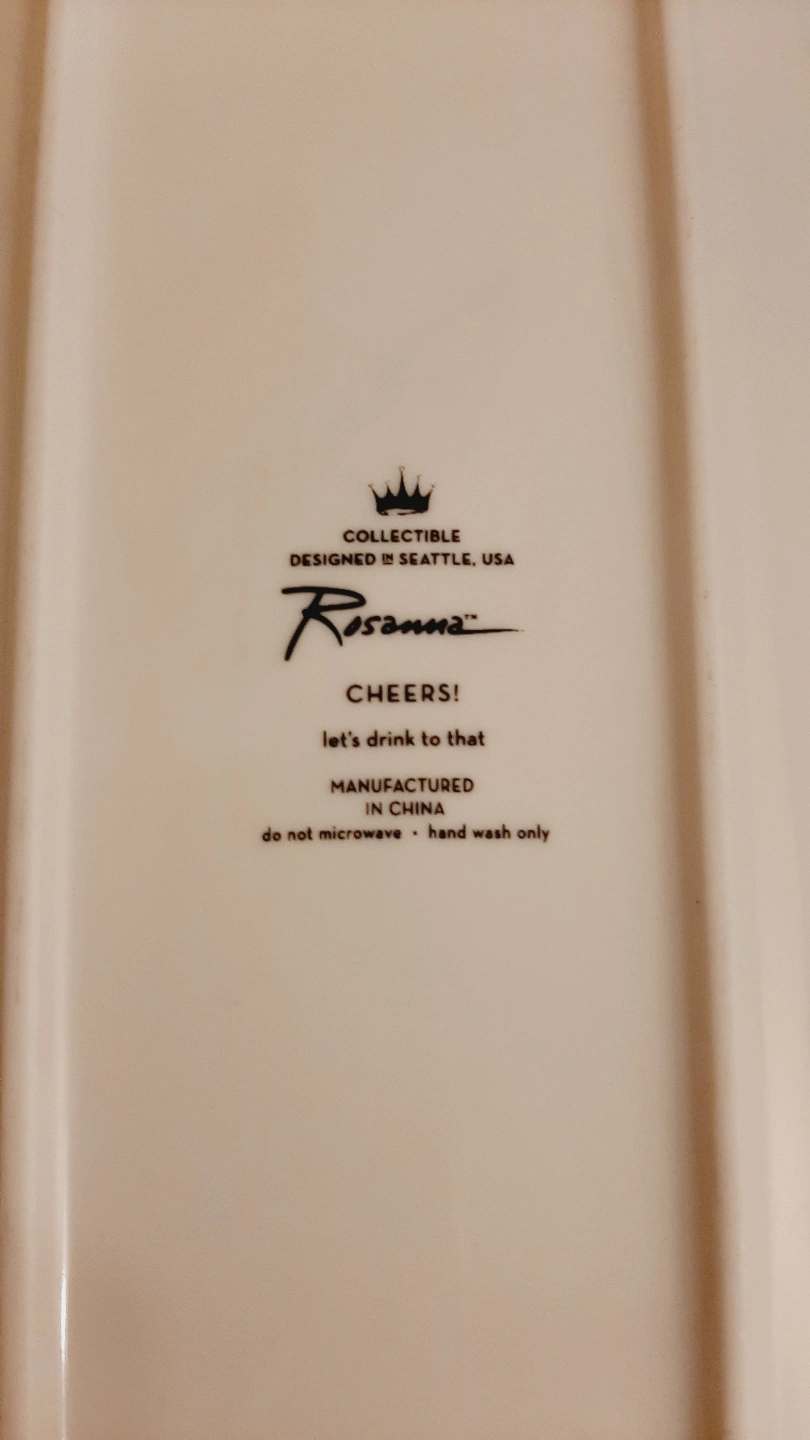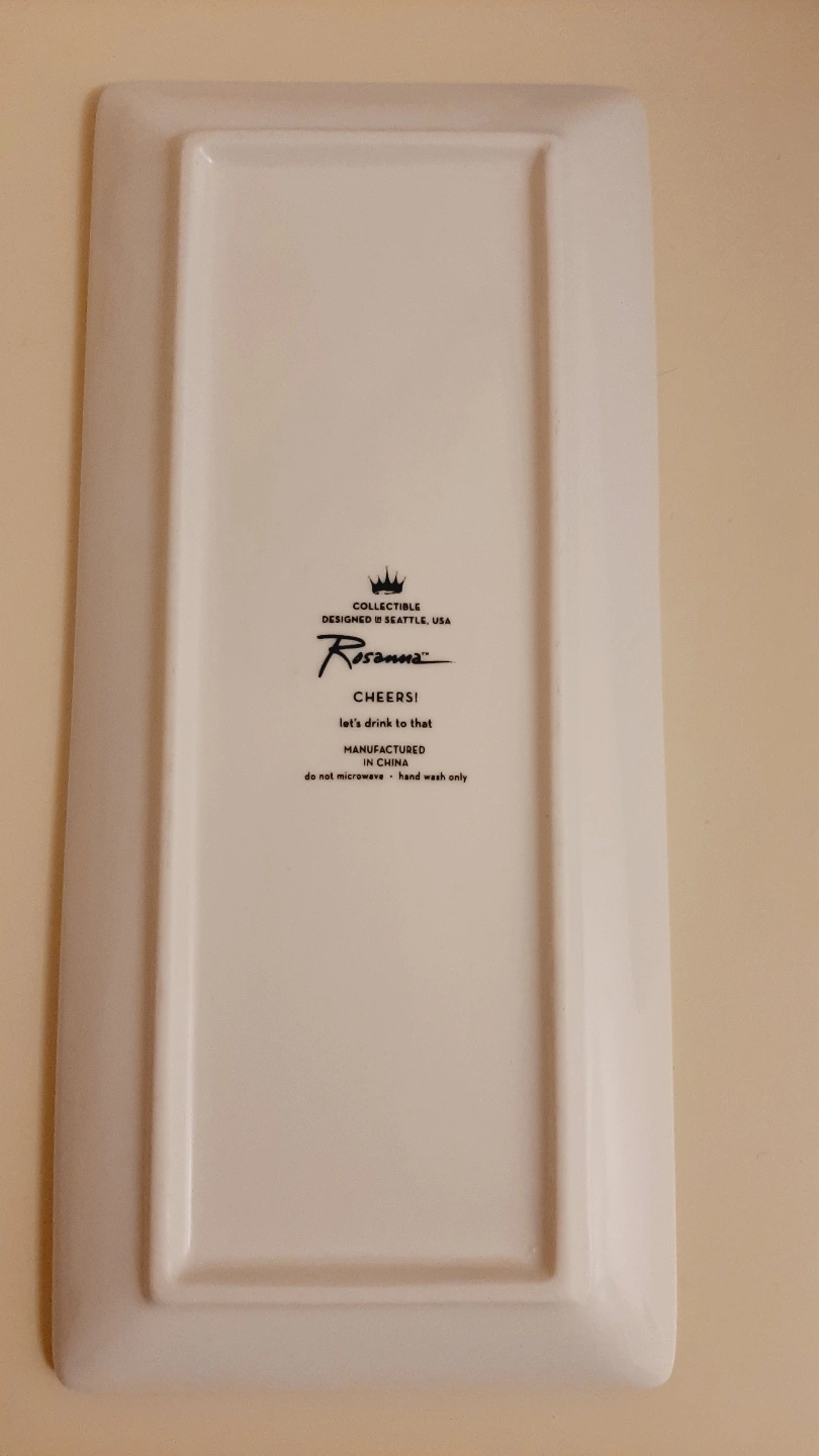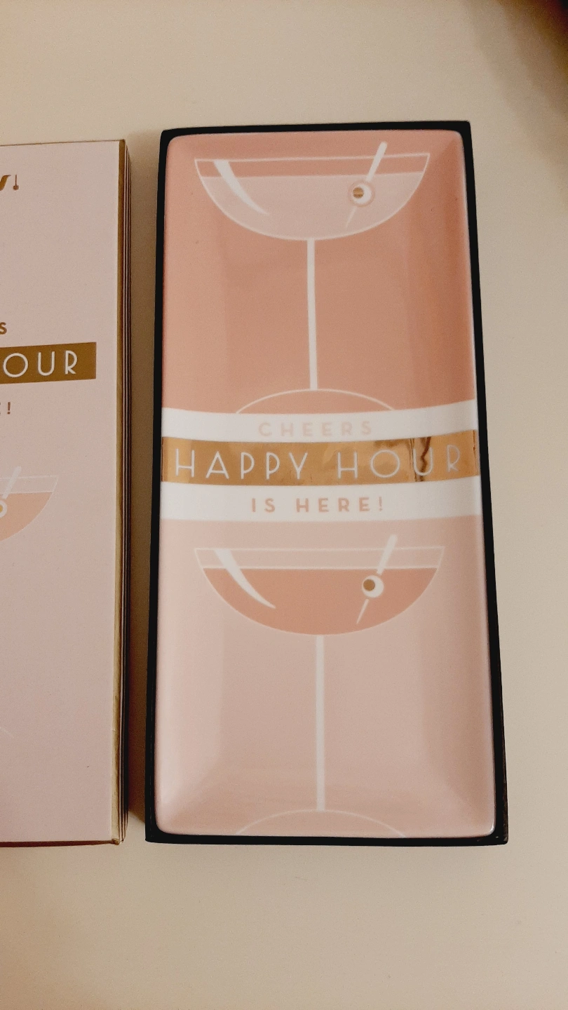 Rectangular serving tray. Features a pink ombre design with martini glasses and gold lettering. Says "Cheers Happy Hour Is Here!" Hand wash only. New, never used & in excellent condition.