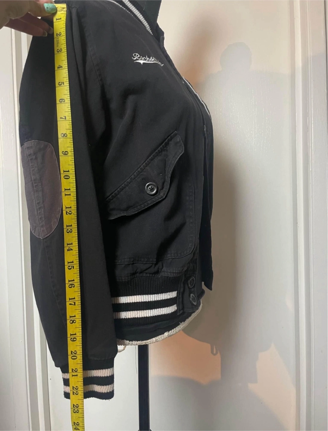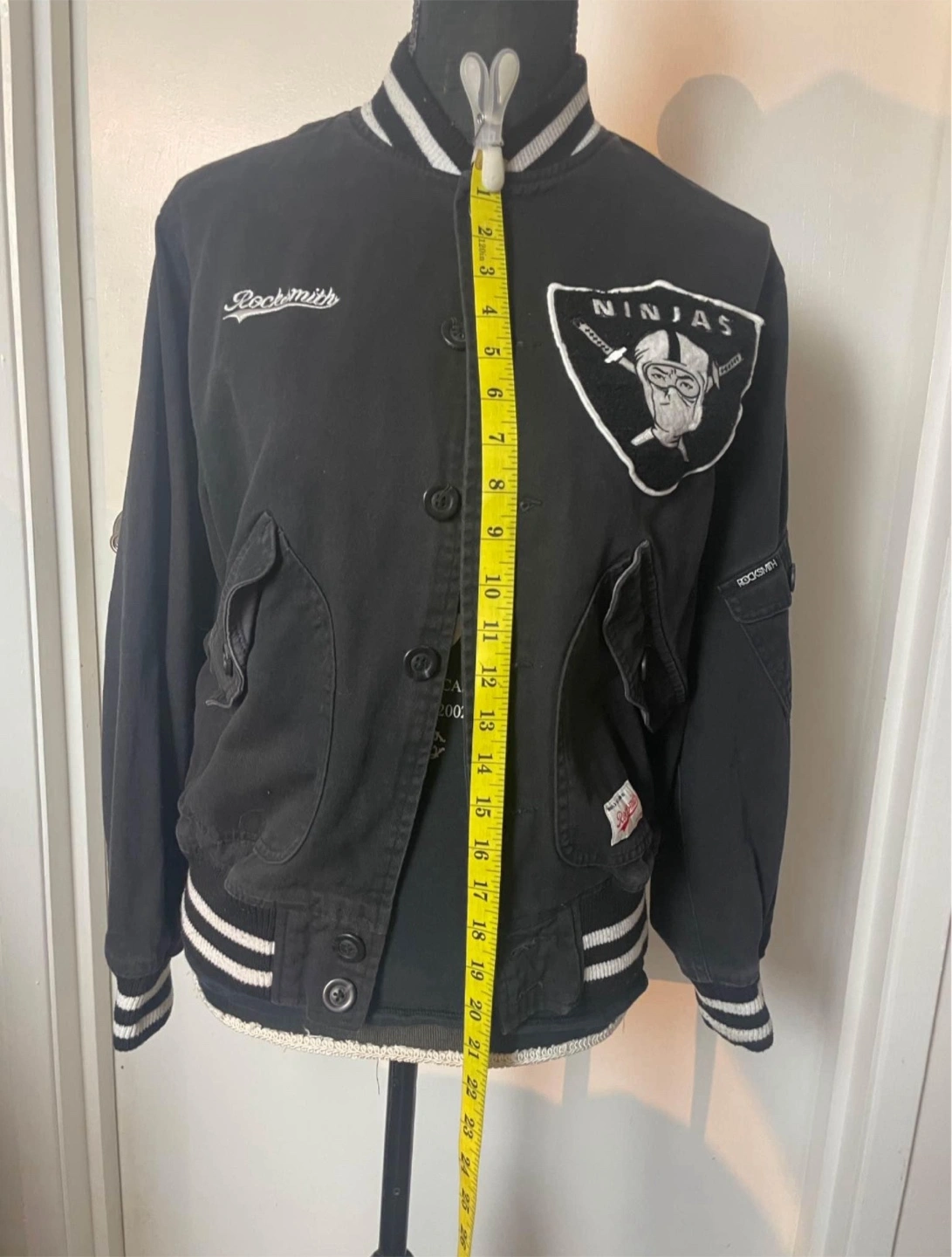 Black varsity jacket. Features ribbed cuffs and hem. Embroidered Rocksmith logo and Ninjas graphic. Patch on sleeve. Pockets.