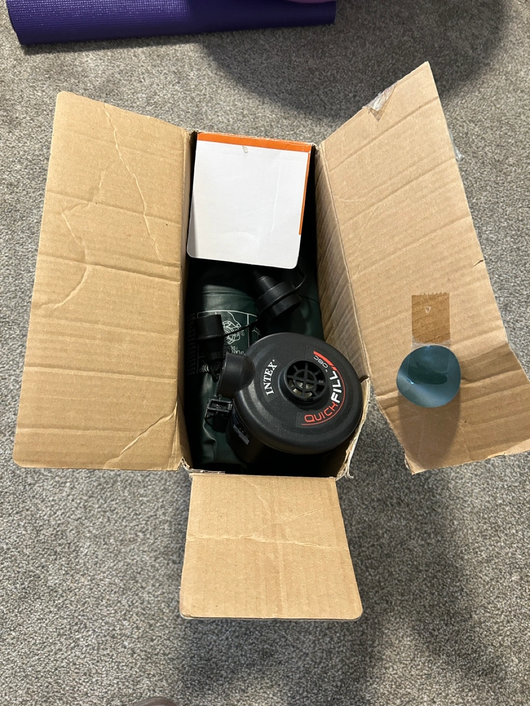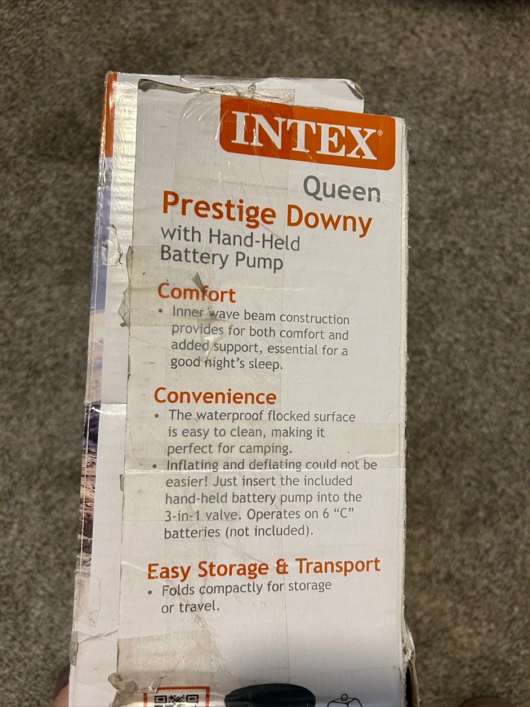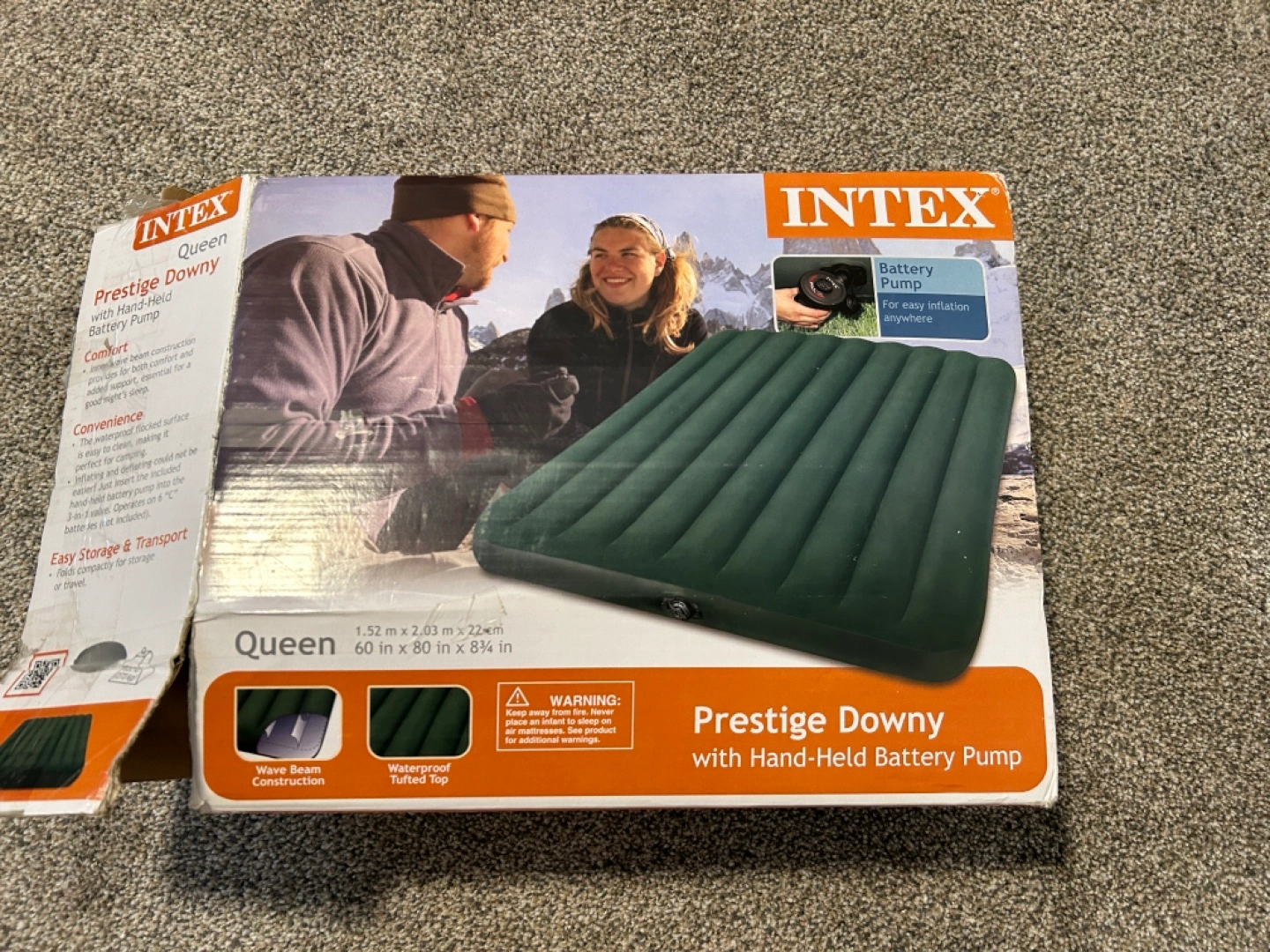 Only used a few times. Queen-size inflatable air mattress. Includes hand-held battery pump. Waterproof flocked top. Folds compactly for storage or travel. Easy to clean.