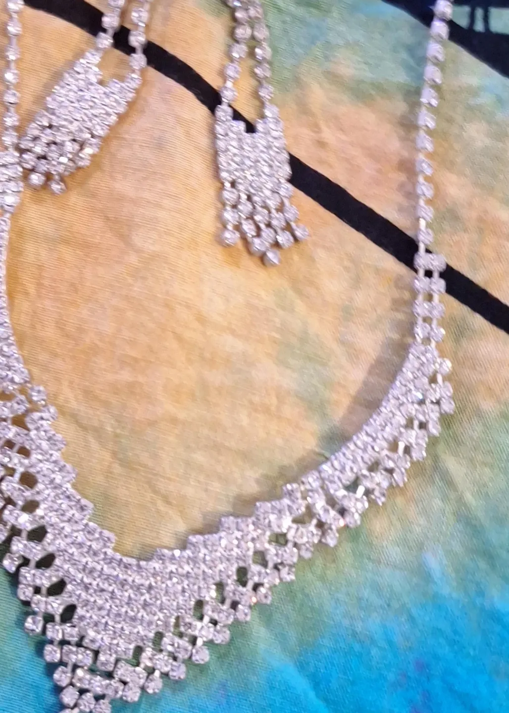 Gorgeous rhinestone necklace and earring set. Silver-toned metal. Elegant design. Perfect for a special occasion.