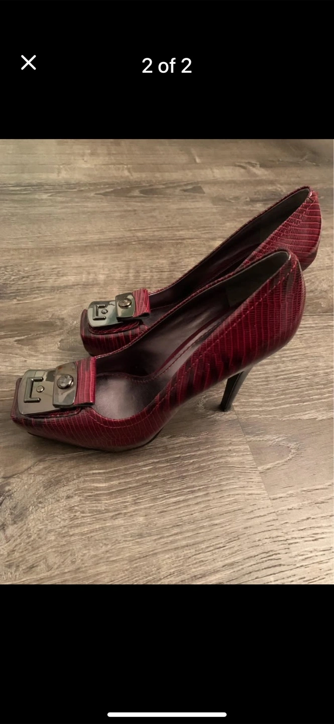Beautiful pair of Nine West high heels. Red snakeskin print. Square toe. Metal accent. Excellent condition.